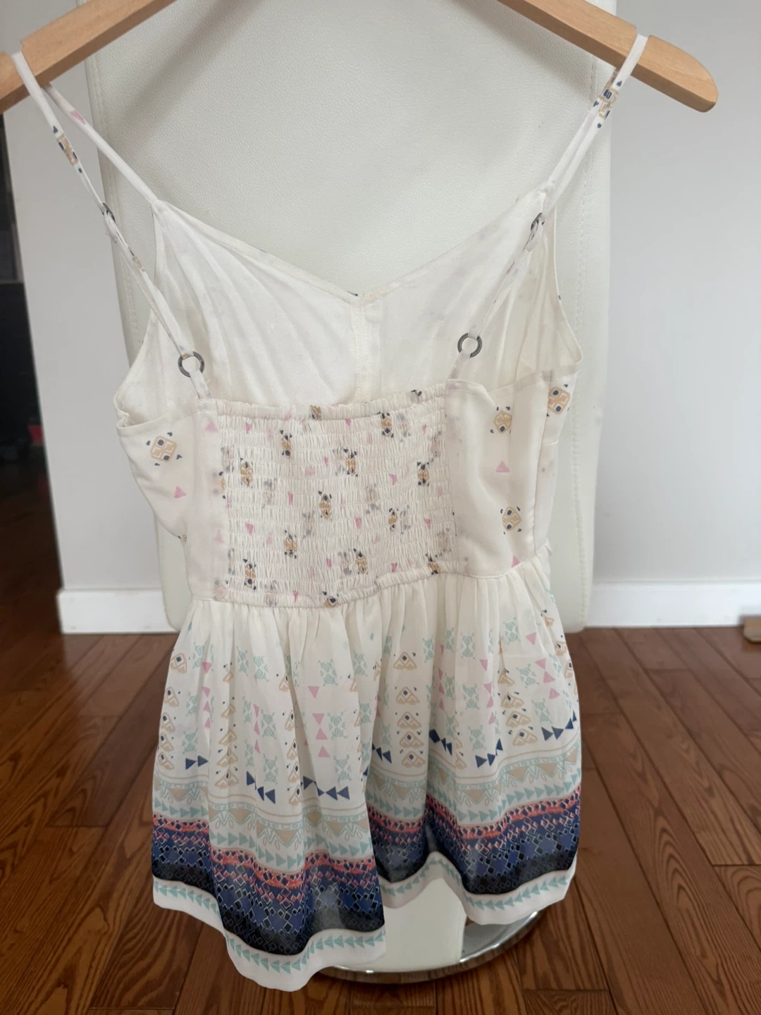 This cute Hollister white tank top features a smocked back and an all-over pug print with a bohemian-inspired patterned hem. It's lightweight and perfect for warm weather! It has adjustable spaghetti straps.