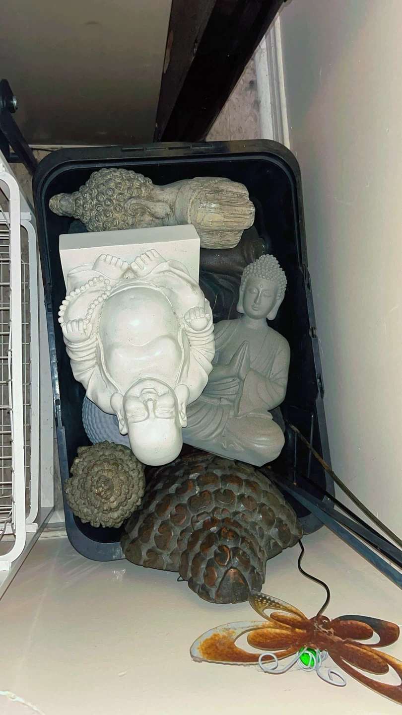 Collection of various Buddha statues and decorative pieces. Includes a large white Buddha, a grey seated Buddha, and other decorative ornaments. Made from stone-like material.