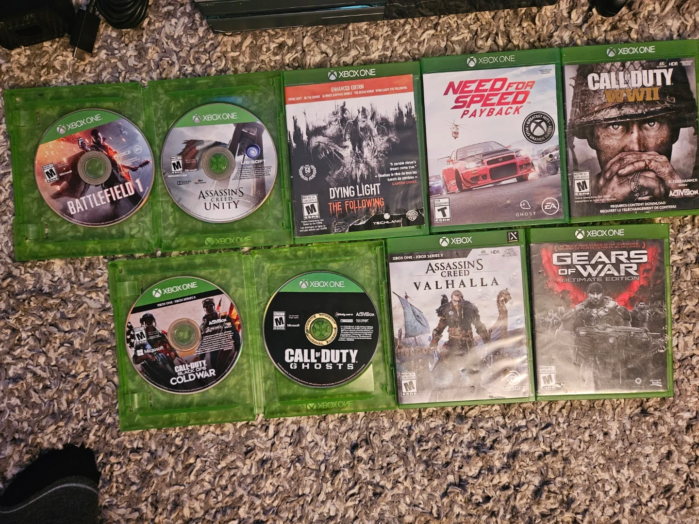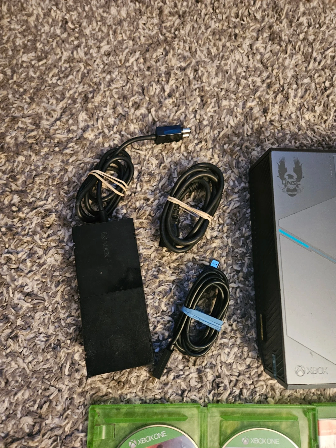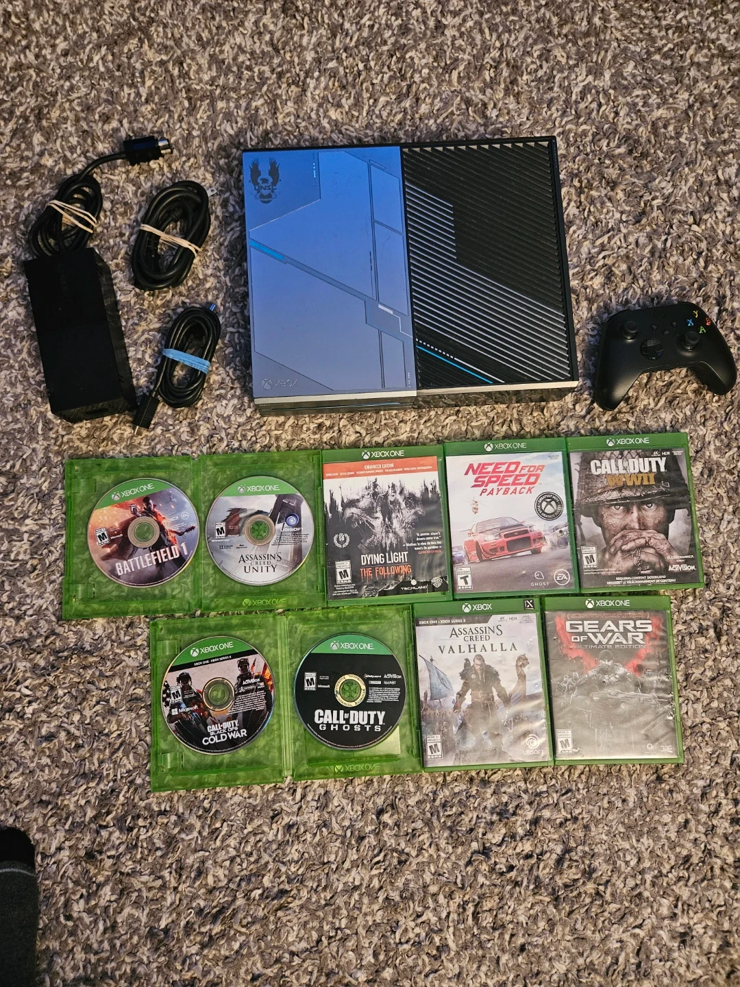 This is an Xbox One Halo Edition console. It comes with a power brick, HDMI cable, and a controller. Also included are several games: Battlefield, Assassin's Creed Unity, Dying Light, Need for Speed Payback, Call of Duty WWII, Assassin's Creed Valhalla, Call of Duty Ghosts, Call of Duty Cold War, and Gears of War. This bundle is great for any Halo fan looking to jump into gaming!
