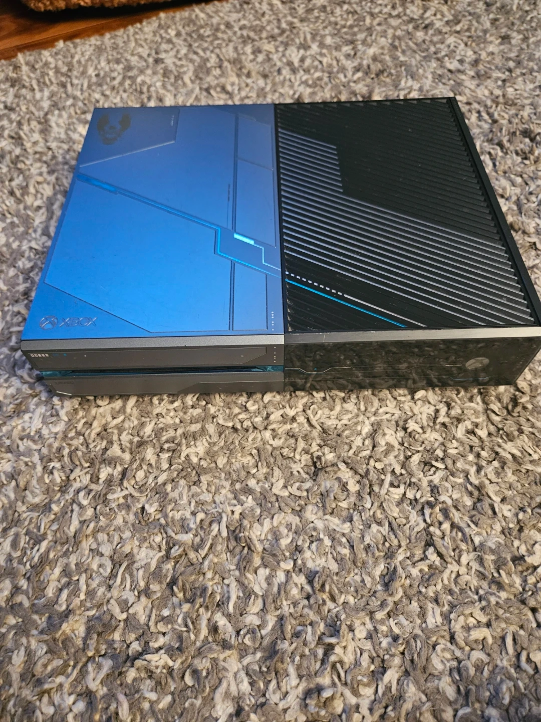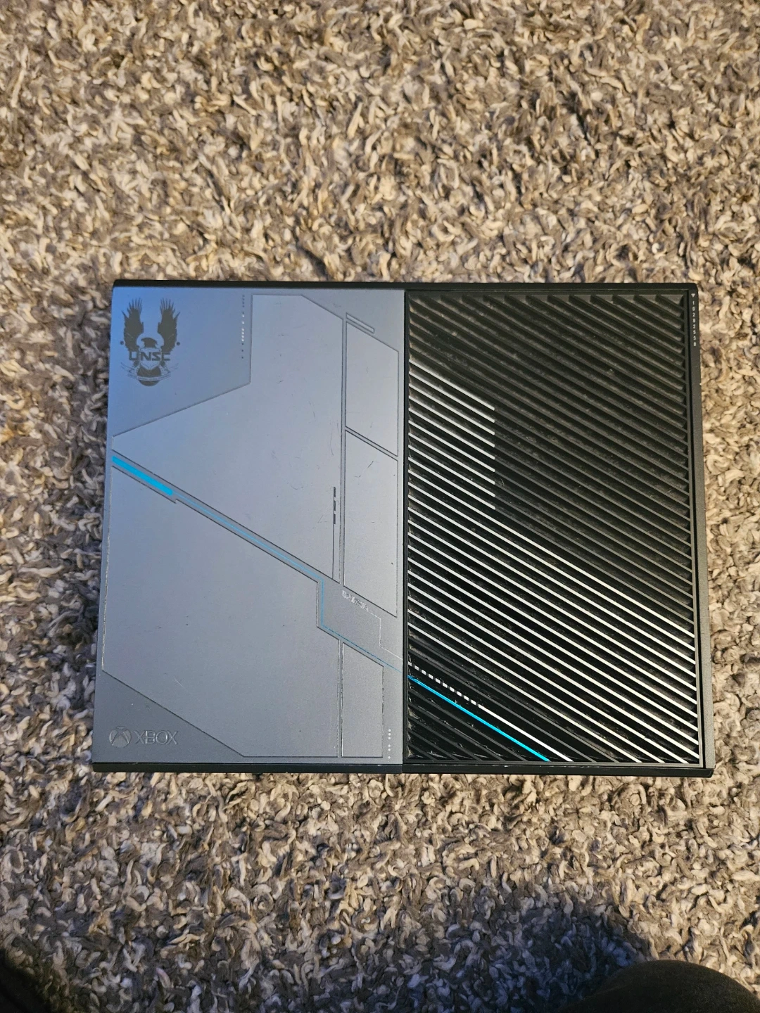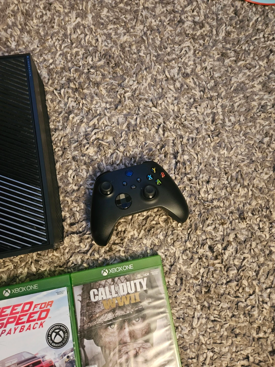 This is an Xbox One Halo Edition console. It comes with a power brick, HDMI cable, and a controller. Also included are several games: Battlefield, Assassin's Creed Unity, Dying Light, Need for Speed Payback, Call of Duty WWII, Assassin's Creed Valhalla, Call of Duty Ghosts, Call of Duty Cold War, and Gears of War. This bundle is great for any Halo fan looking to jump into gaming!