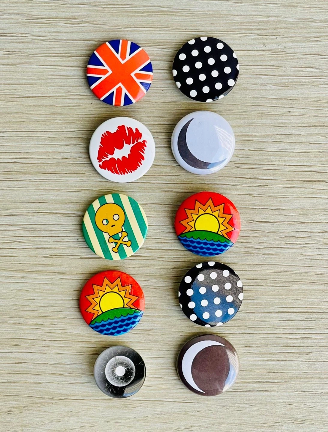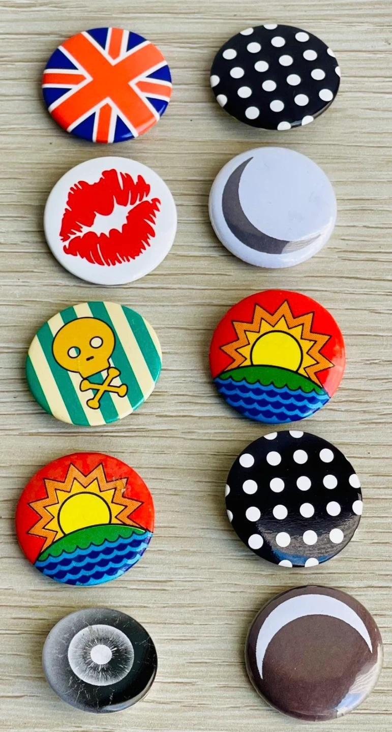 This set includes 10 unique button pins. Designs feature a Union Jack flag, polka dots, a red kiss, a crescent moon, a cartoon character, and a sunset scene. They're great for personalizing bags or jackets!