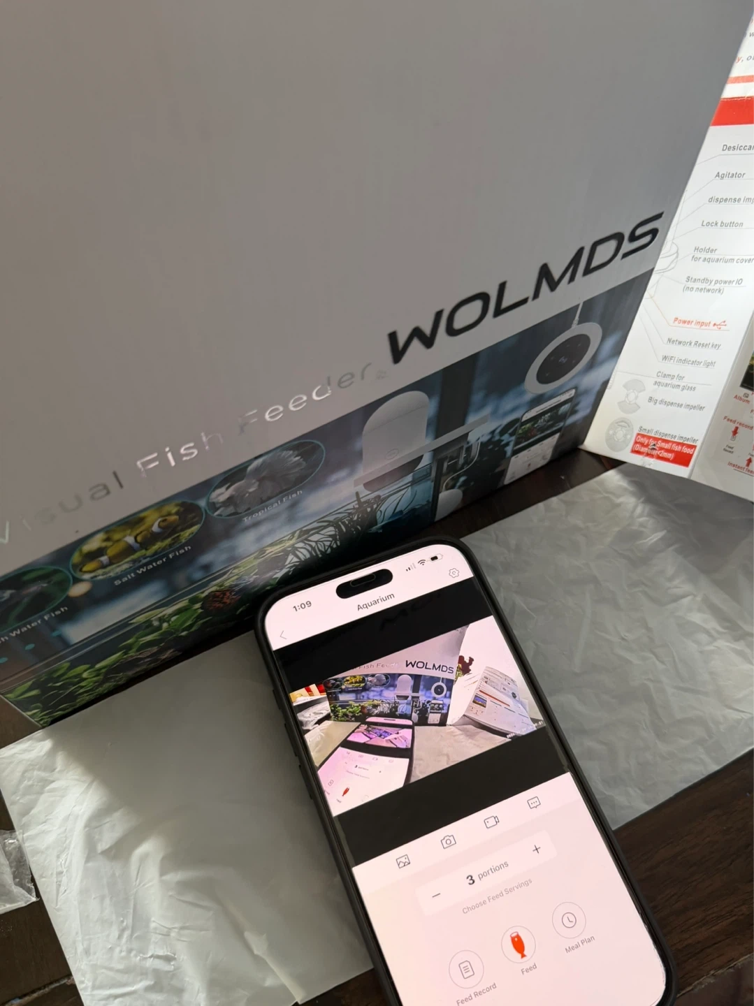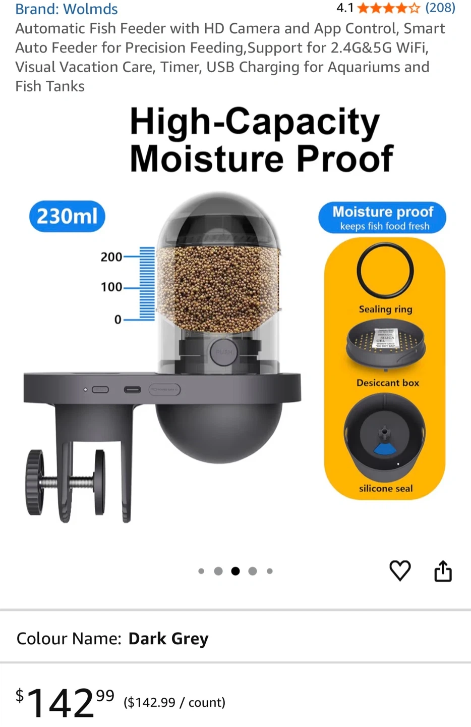This is a WOLMDS visual fish feeder with an HD camera and app control. It has a 230ml capacity and supports 2.4G & 5G WiFi. It's ideal for vacation care and timers. The unit is designed for both fresh and saltwater fish tanks.