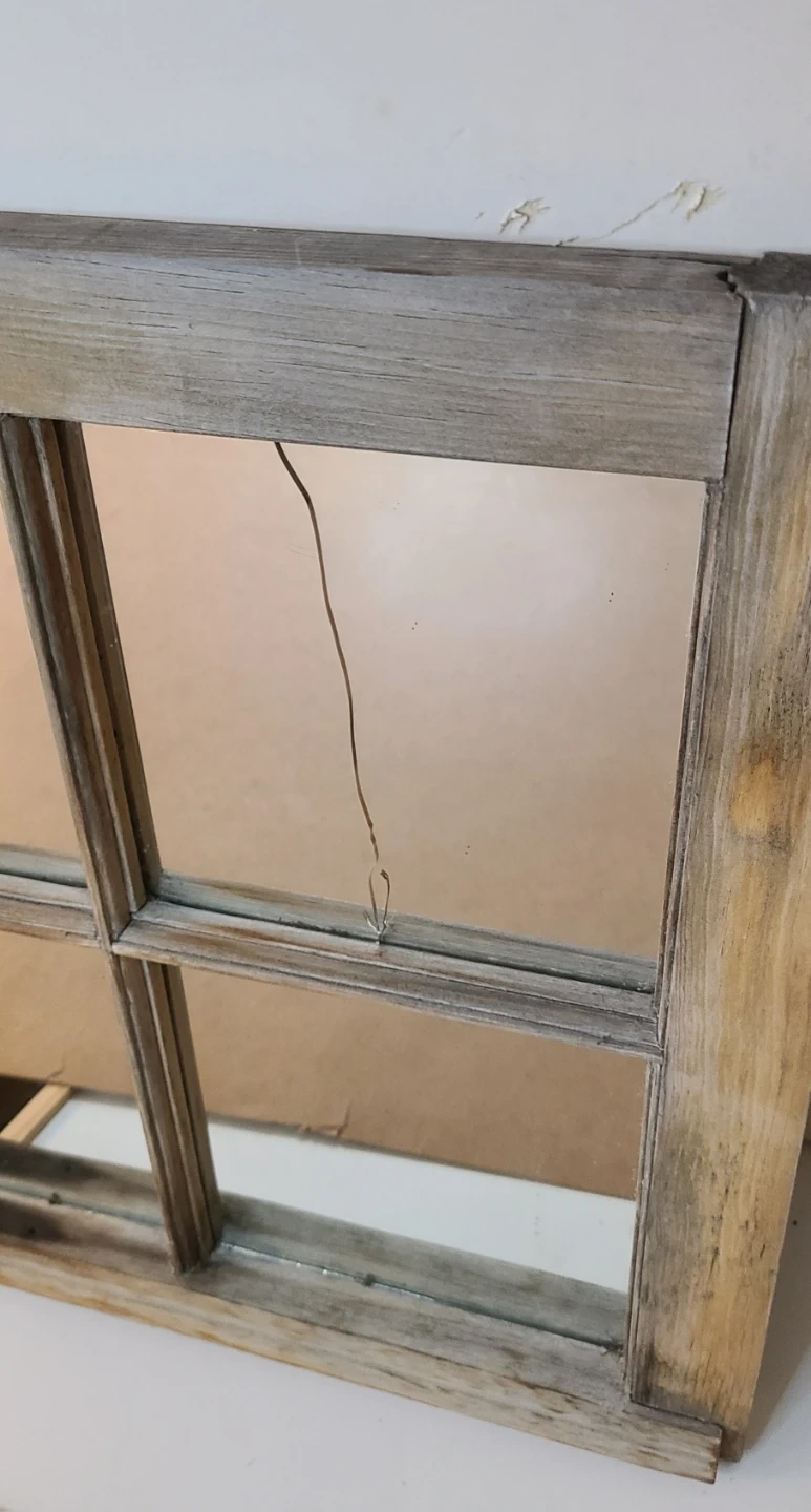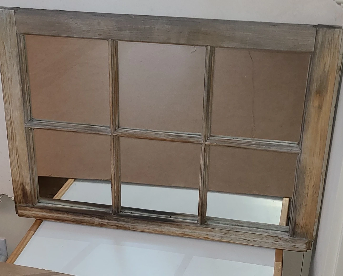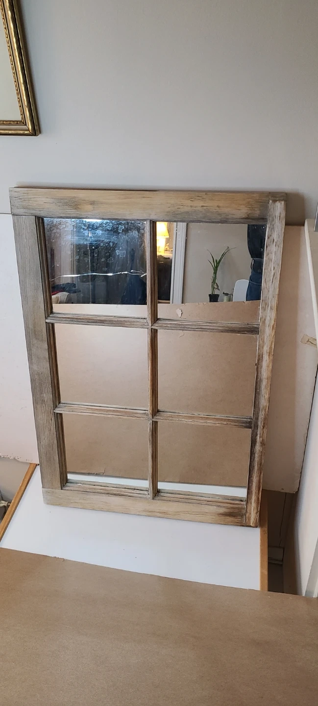 Very old window from an over century old farmhouse. Paint was stripped & sanded, mirror pieces installed.