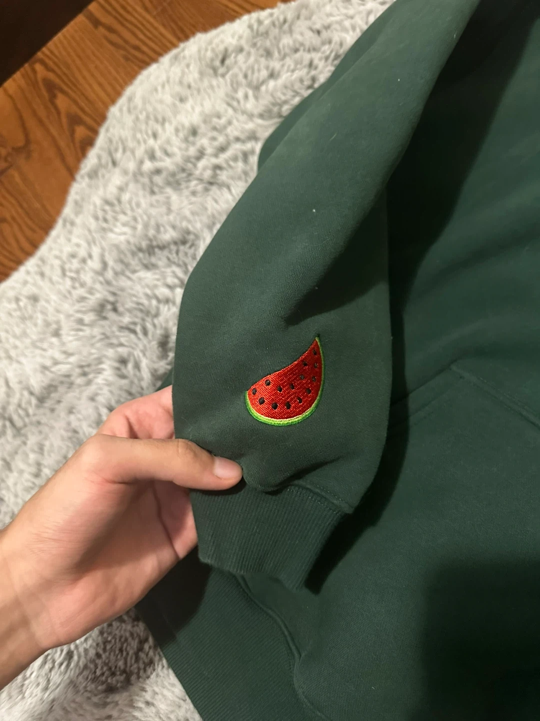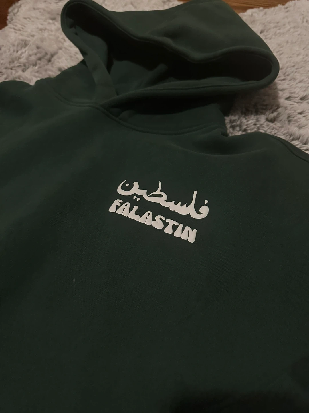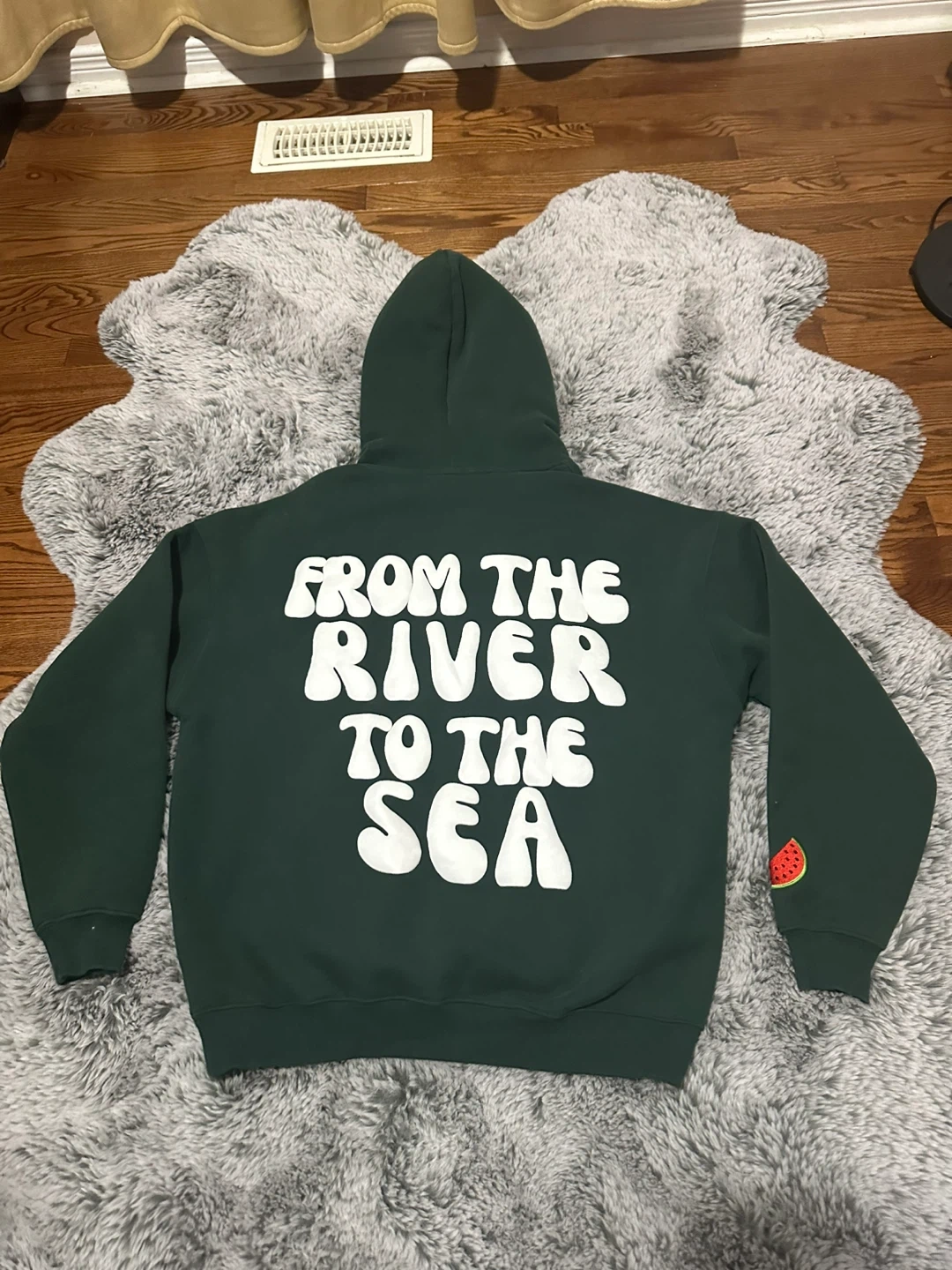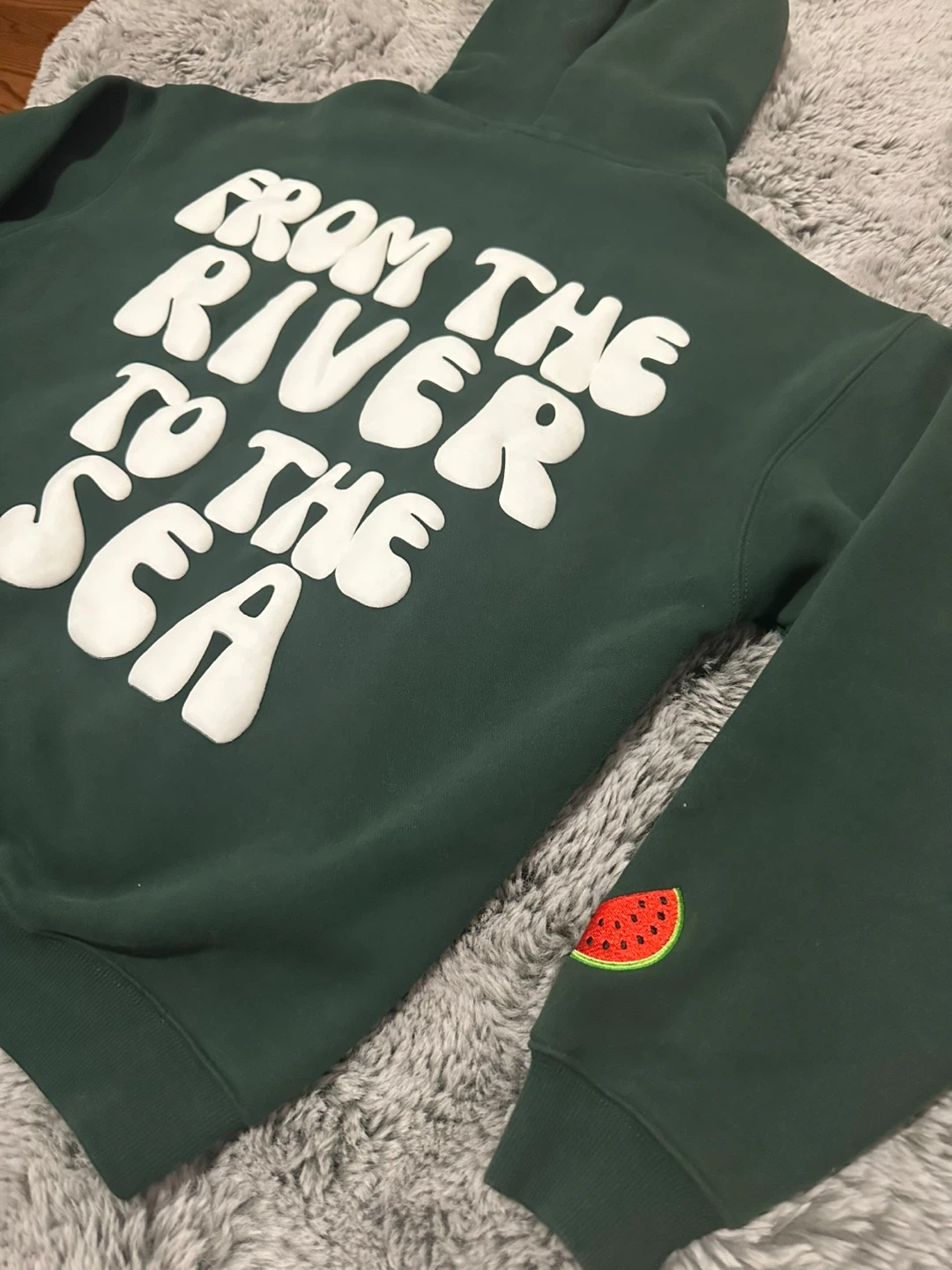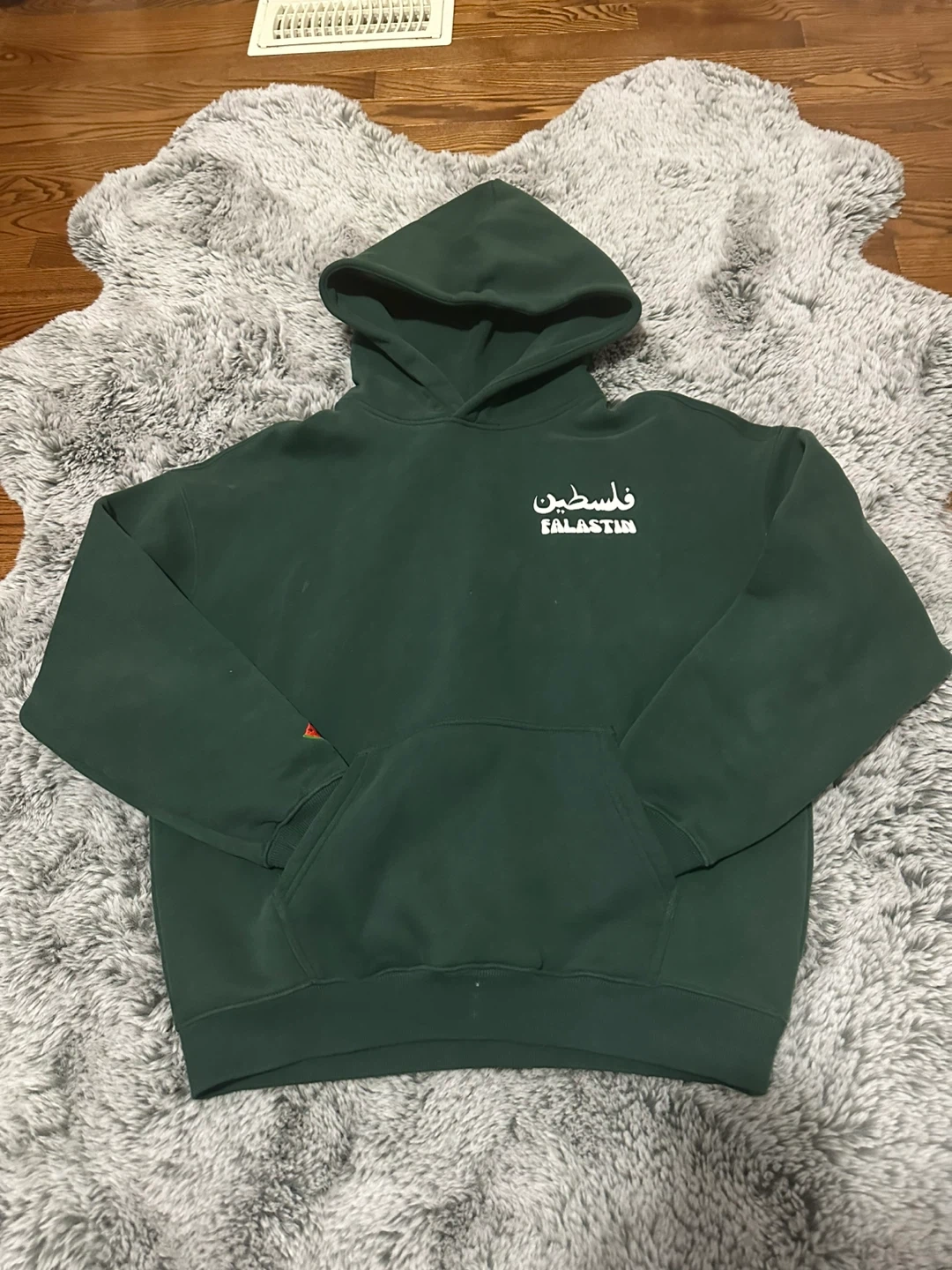 Selling a cozy green hoodie with "Falastin" written on the front and "From the River to the Sea" on the back. There's also a cute little watermelon detail on the sleeve. It's in great condition and ready for a new home!