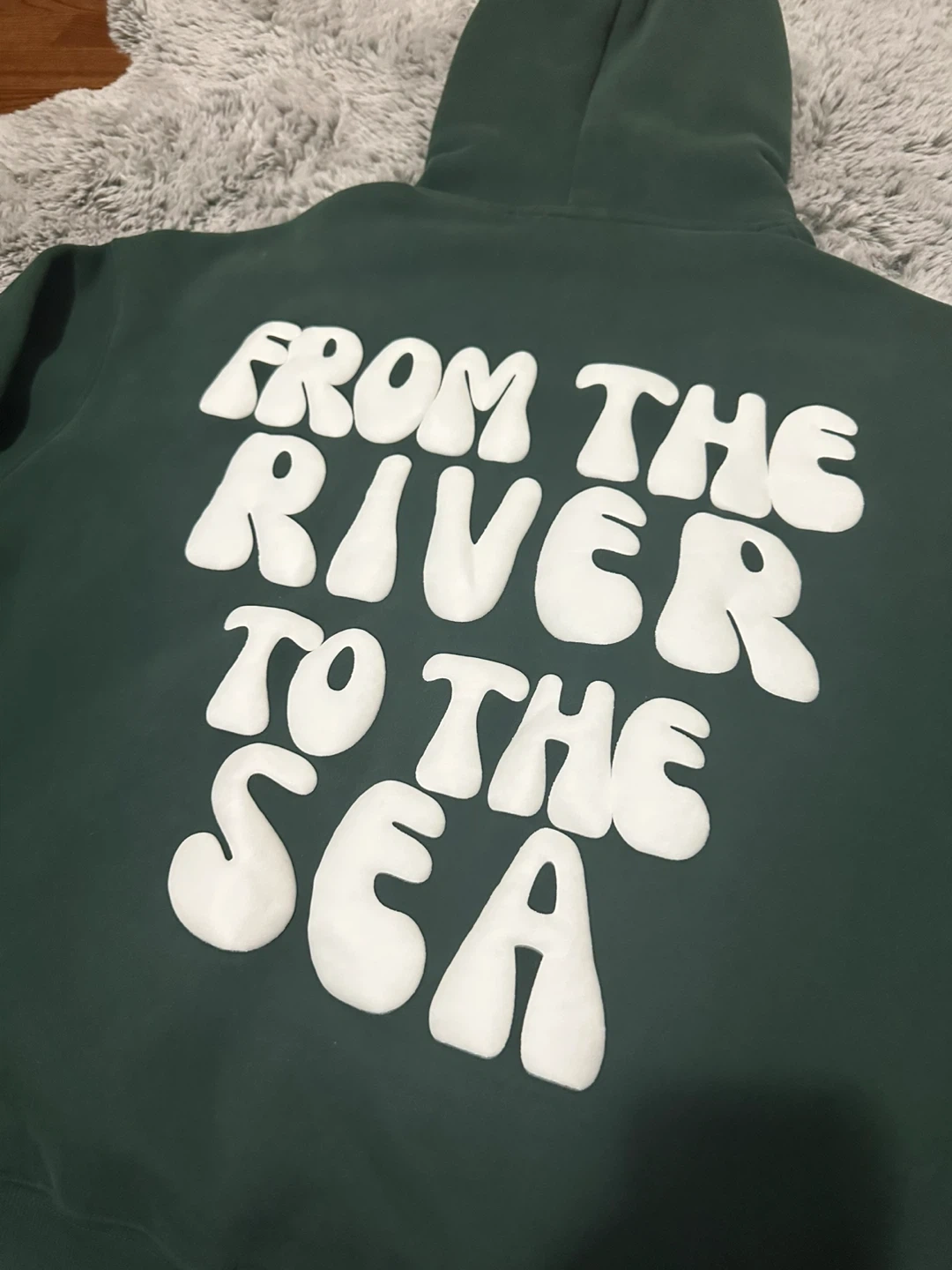 Selling a cozy green hoodie with "Falastin" written on the front and "From the River to the Sea" on the back. There's also a cute little watermelon detail on the sleeve. It's in great condition and ready for a new home!