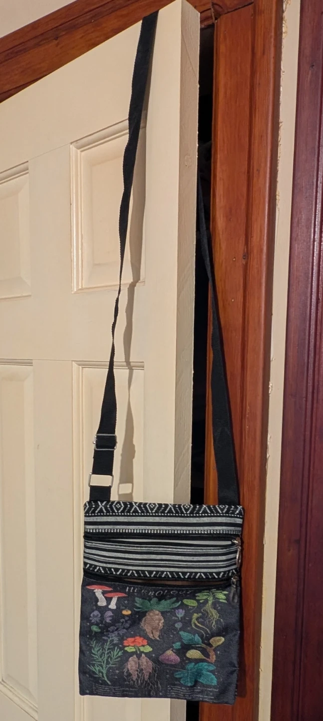 Herbology/botanical print with mushrooms and plants. Adjustable strap. $5
