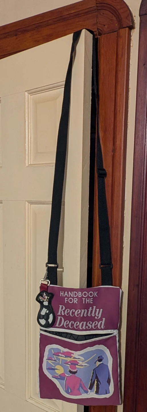 'Handbook for the Recently Deceased' design on the front. Adjustable strap. $15.