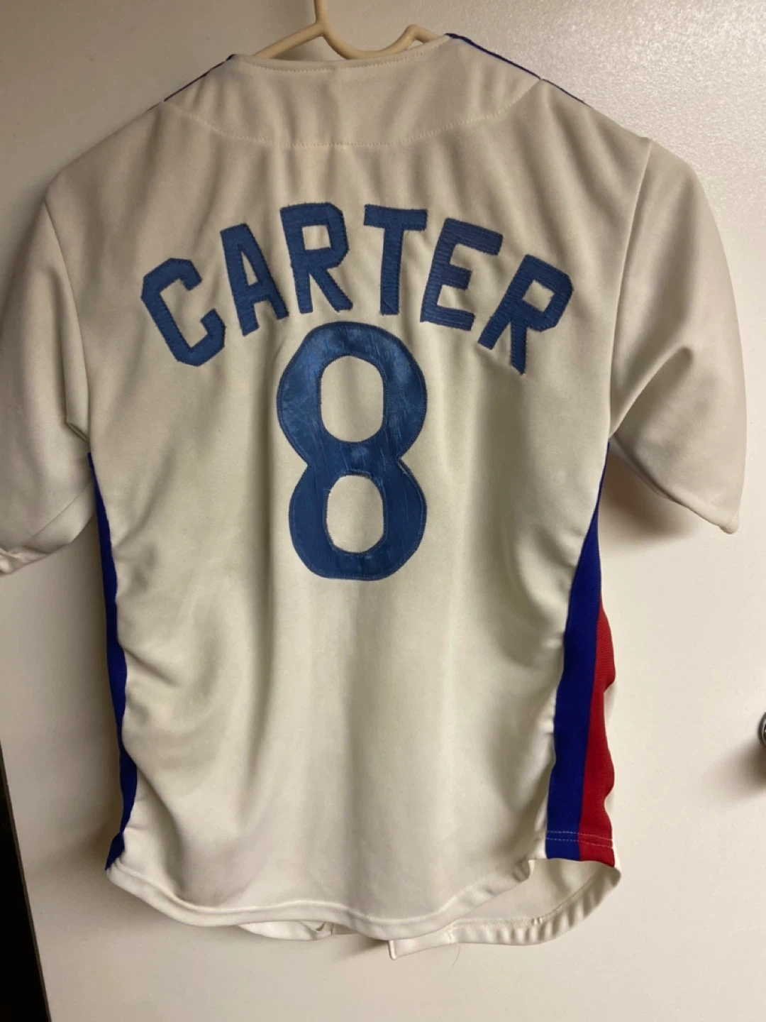 This is a Montreal Expos baseball jersey with "Carter 8" on the back. It's an officially licensed product. Made by HT Malton, size XP-XS.