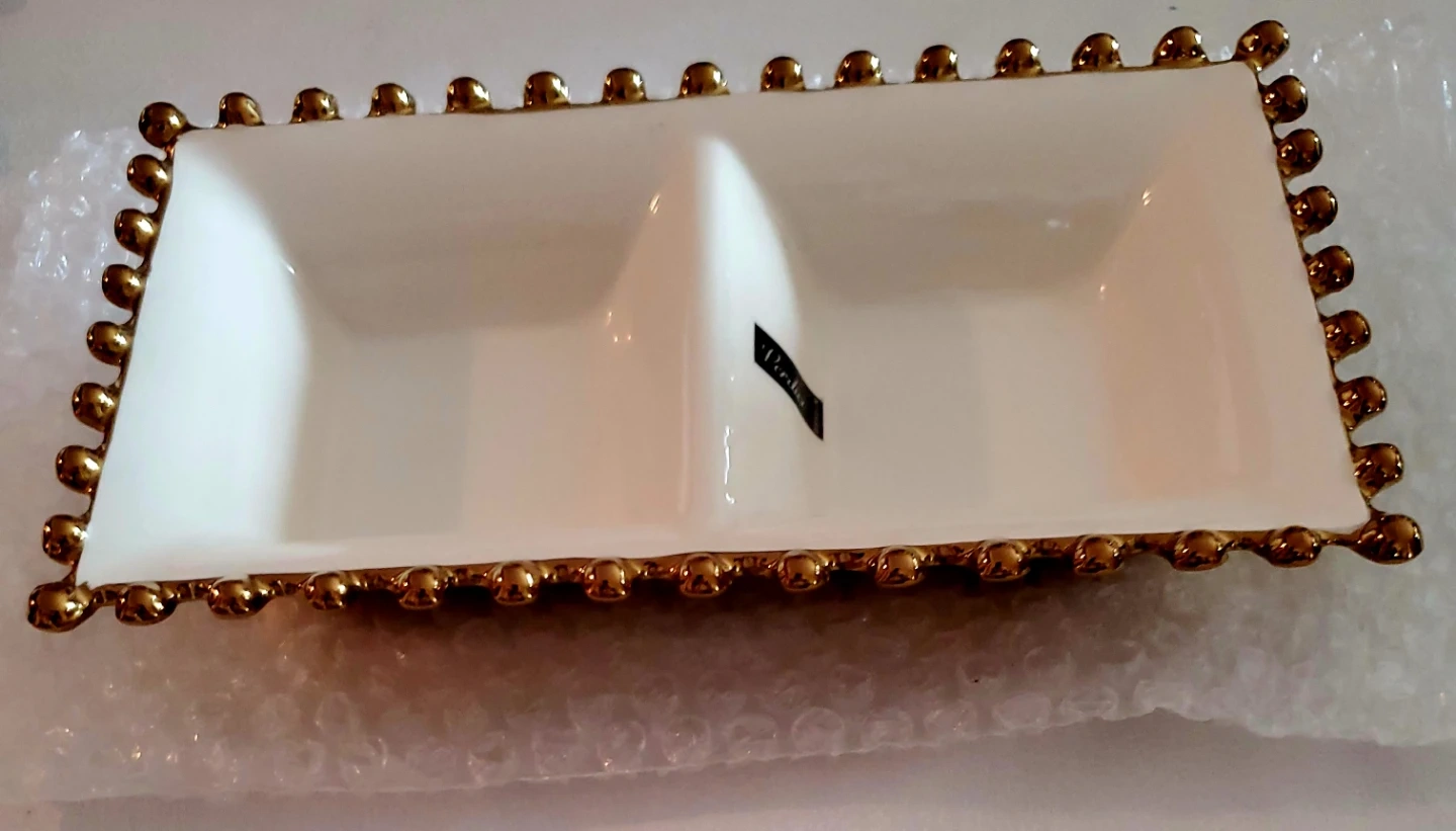 This white ceramic dish has two divided sections. It's finished with a decorative gold beaded trim around the edges. Perfect for serving appetizers or condiments!