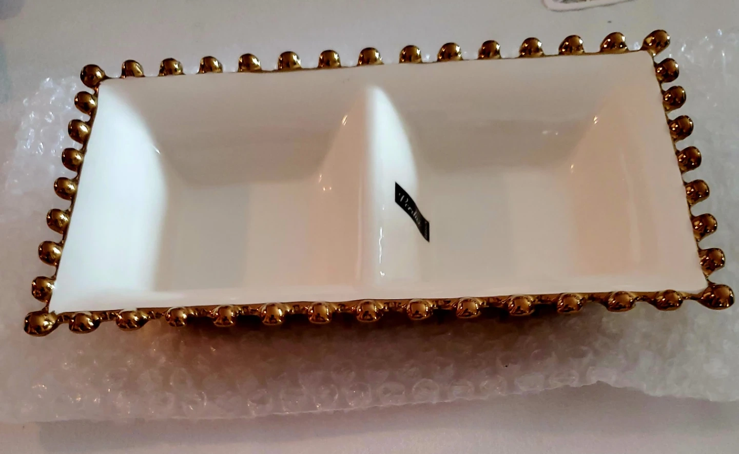 This white ceramic dish has two divided sections. It's finished with a decorative gold beaded trim around the edges. Perfect for serving appetizers or condiments!