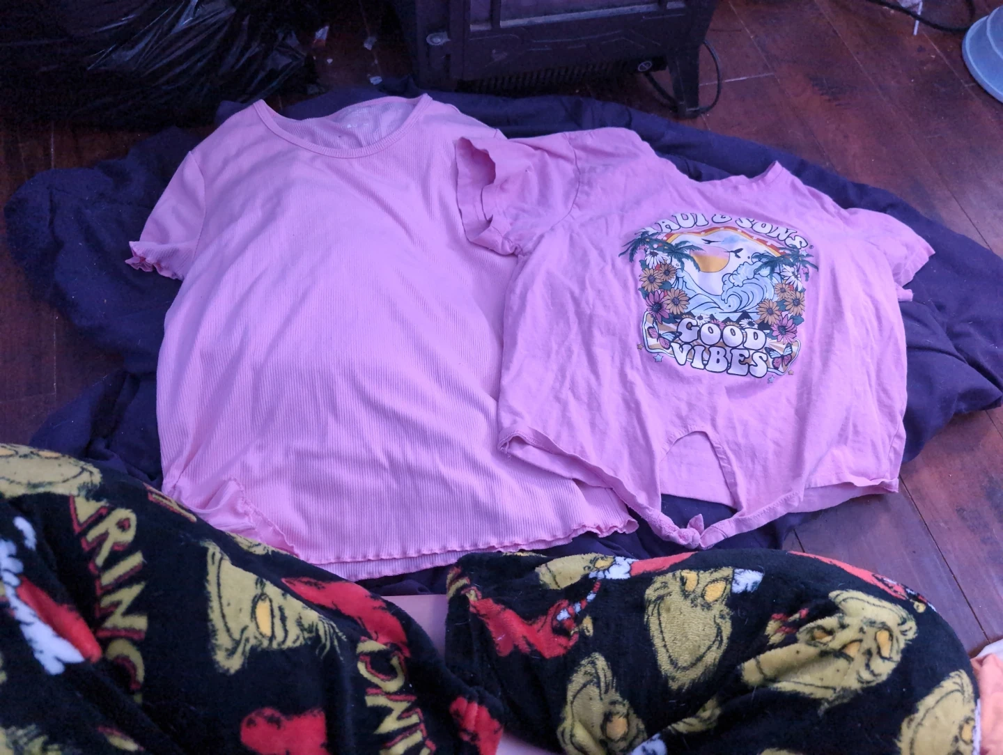 This bundle includes five t-shirts in various colours and designs. One shirt has a lightning bolt with stars graphic, and another features Spongebob Squarepants. The rest are solid coloured. Shirt materials vary but appear to be soft and comfortable for everyday wear.