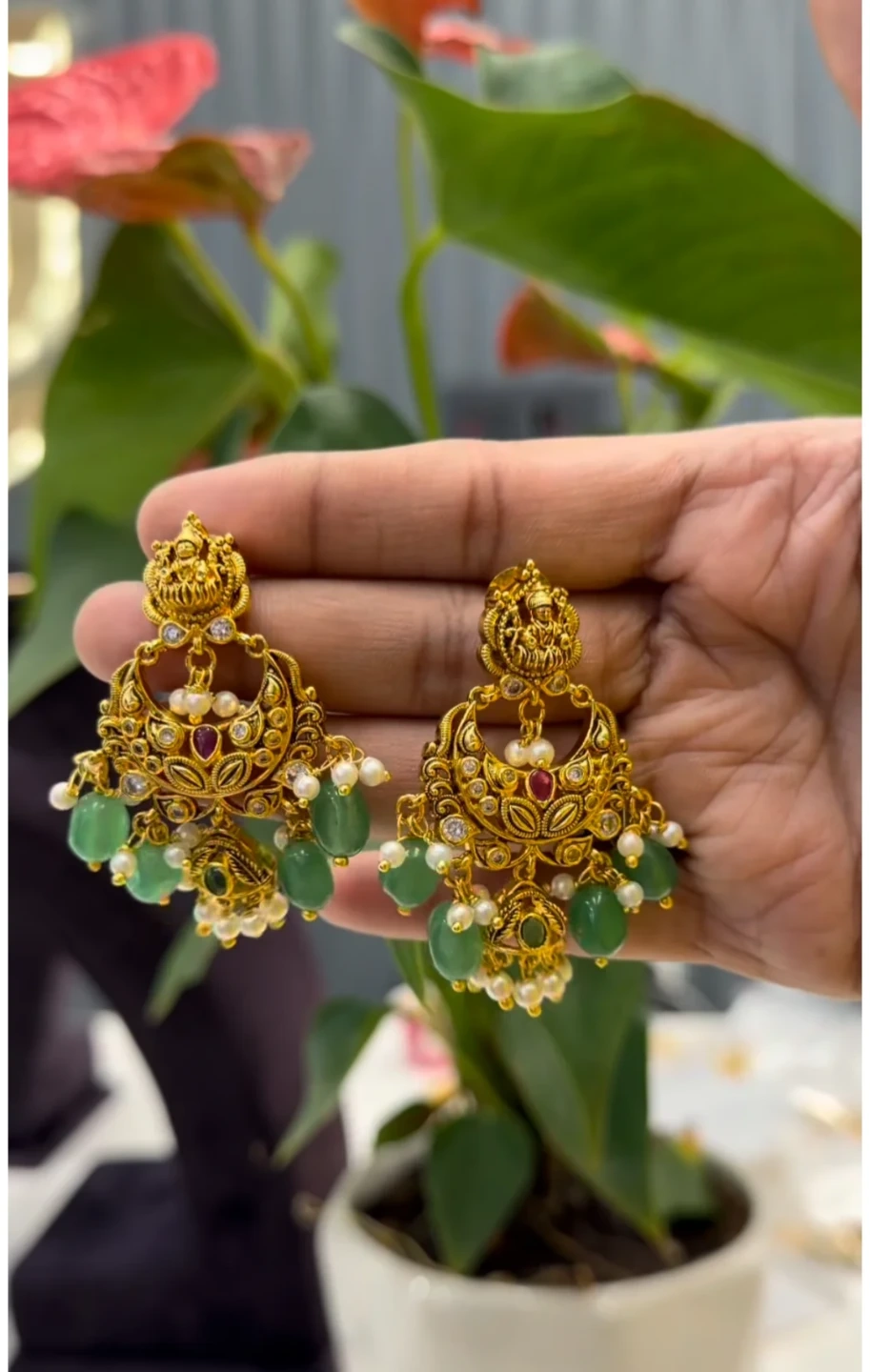 These ornate gold tone dangle earrings feature green jade beads and faux pearls. Intricate detailing includes small red and green accents, along with clear stones. They're designed with a traditional chandelier style.