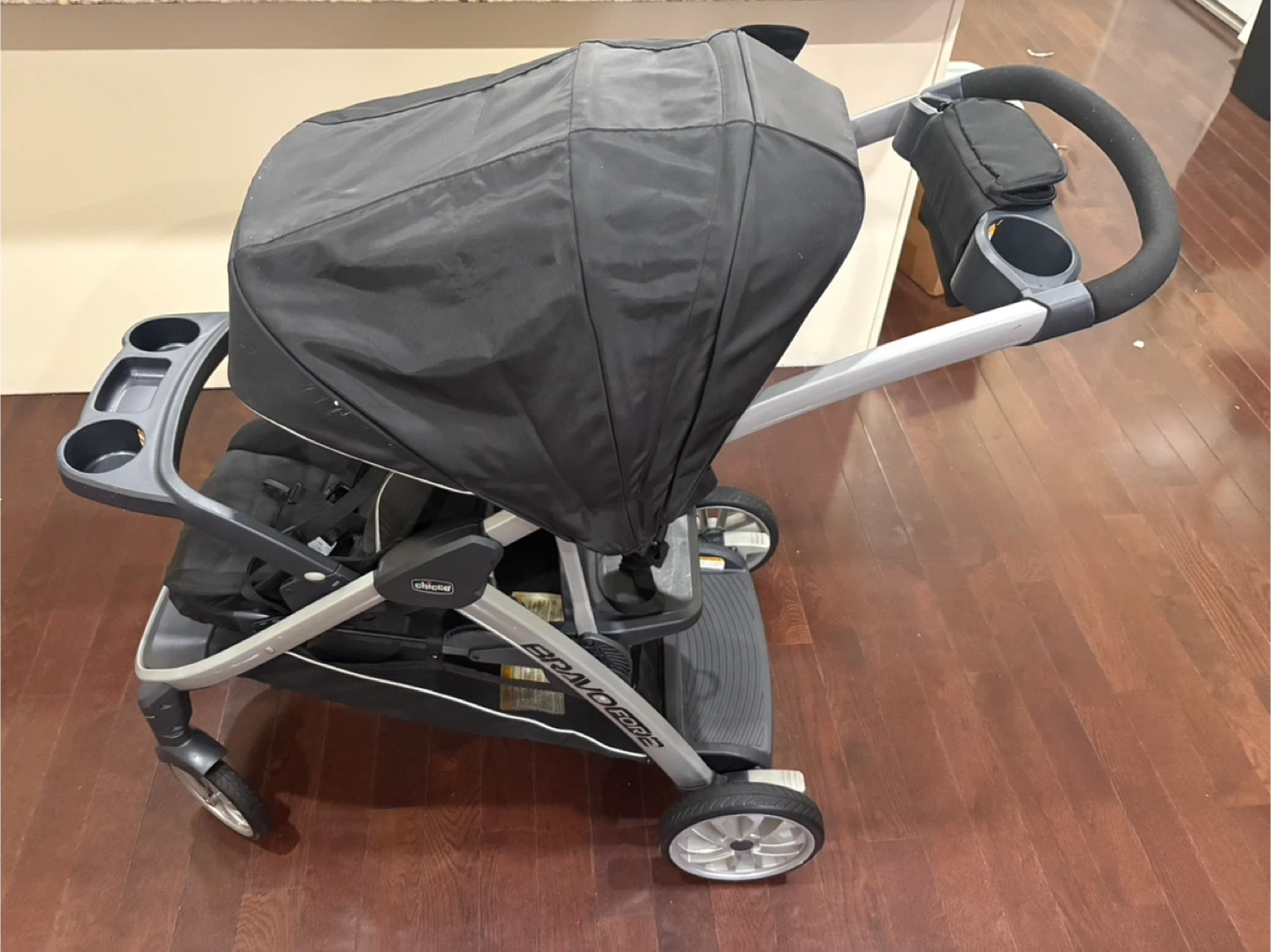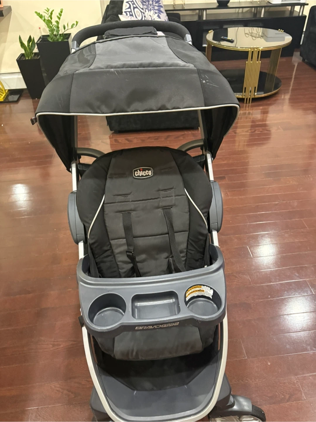 Black Chicco Bravo stroller. Features a child tray with cup holders and a large storage basket. It's great for outings with your little one!