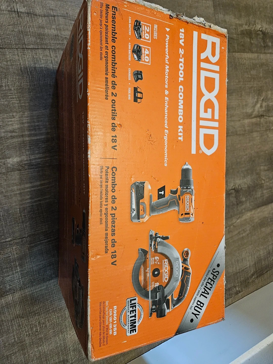 This RIDGID 18V 2-Tool Combo Kit includes a drill and a circular saw. It comes with a 2.0Ah battery, a 4.0Ah battery, a charger, and a tool bag. The tools feature powerful motors and enhanced ergonomics for efficient use.