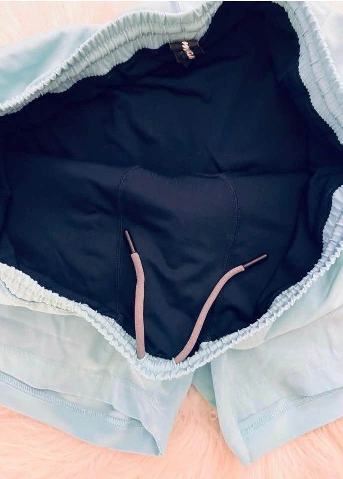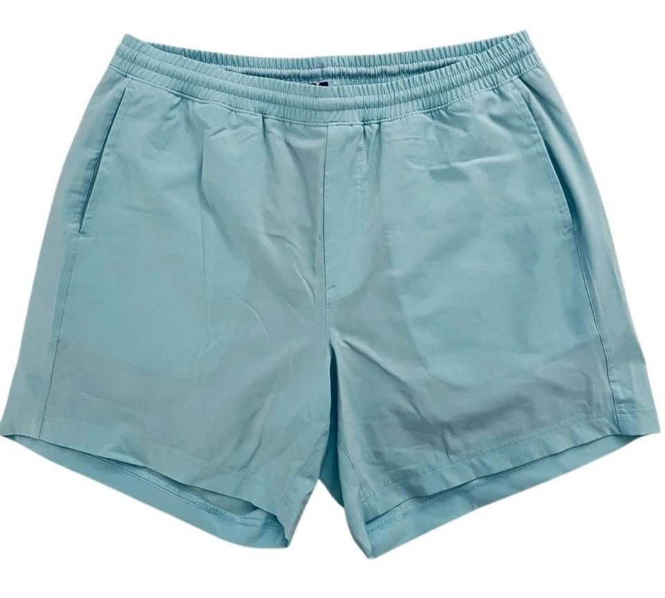 Light blue hybrid shorts with an elastic waistband and adjustable drawstring. Features convenient pockets, including a secure zippered back pocket. Designed for all-day wear, from casual outings to the beach.