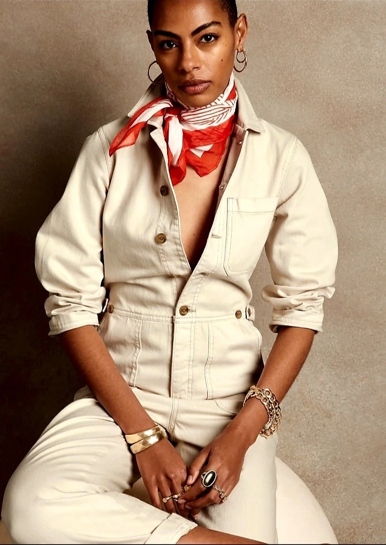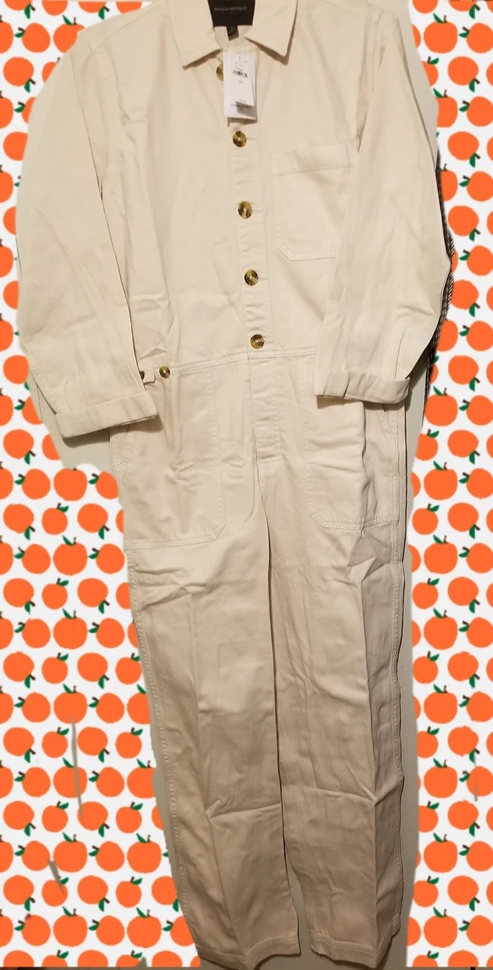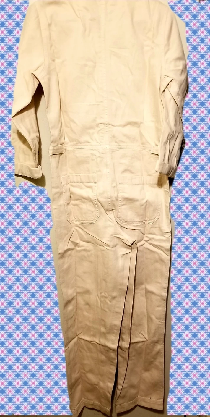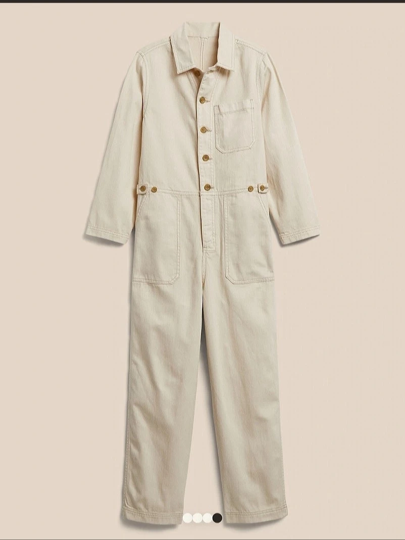 Banana Republic Denim jumpsuit in a Light Ecru color. It's a size 2 Tall. It has Lapel collar, Long Sleeves. Button placket. Front slanted patch pockets. Button-tabs at waisted detail. Perfect for a casual yet stylish look!