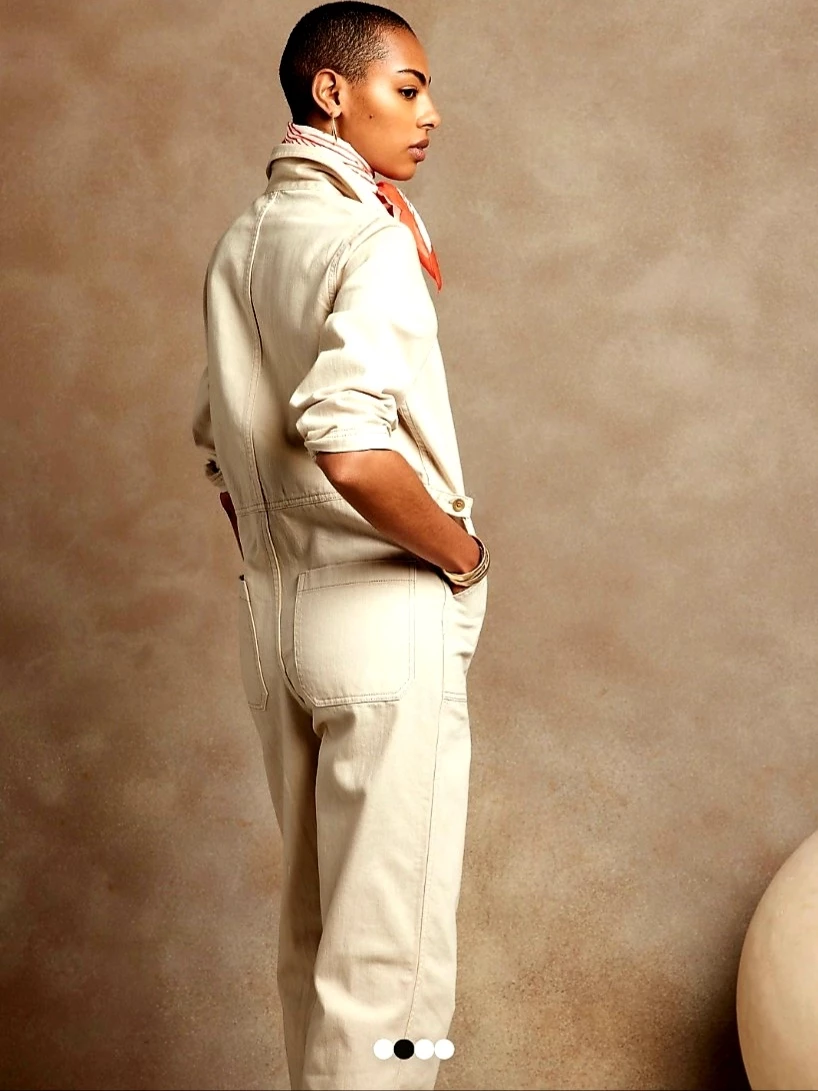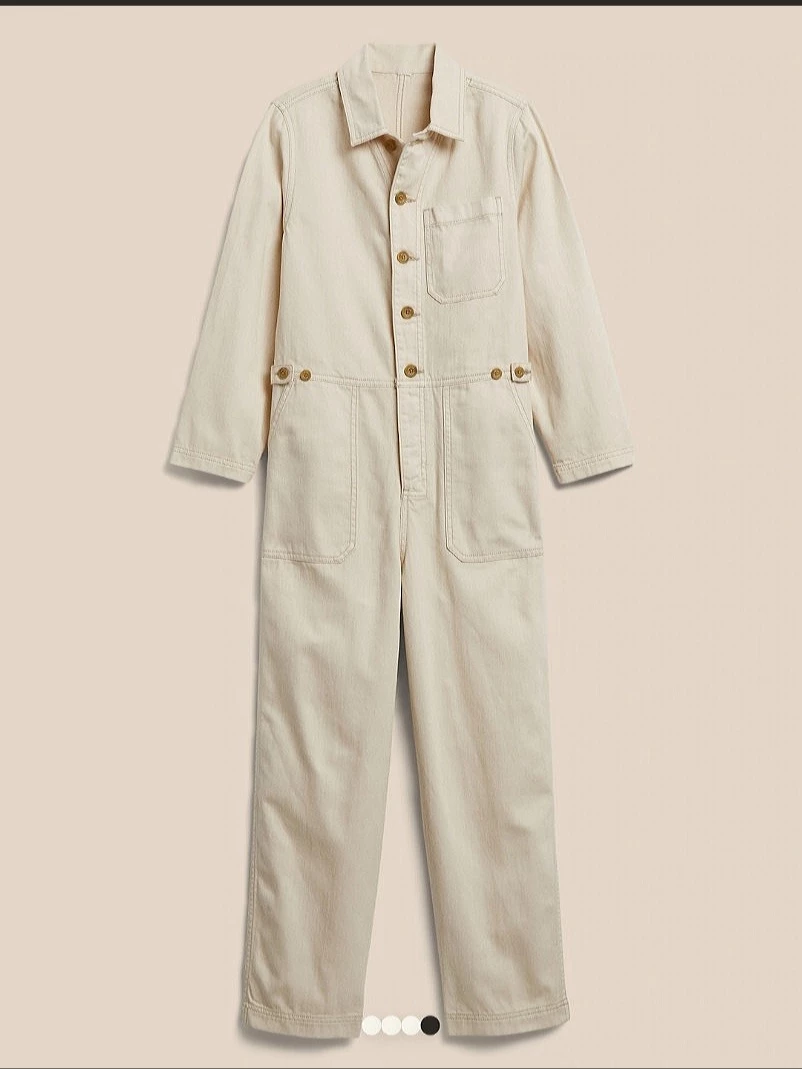 Banana Republic Denim jumpsuit in a Light Ecru color. It's a size 2 Tall. It has Lapel collar, Long Sleeves. Button placket. Front slanted patch pockets. Button-tabs at waisted detail. Perfect for a casual yet stylish look!