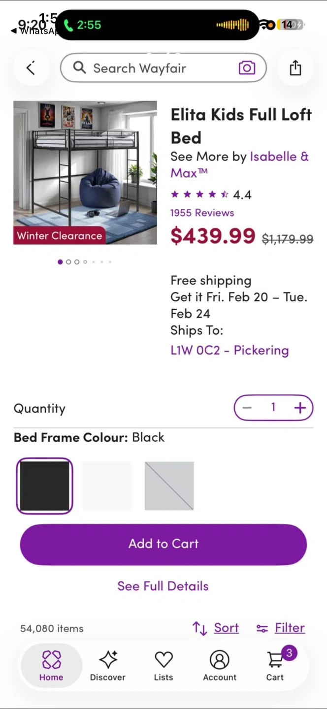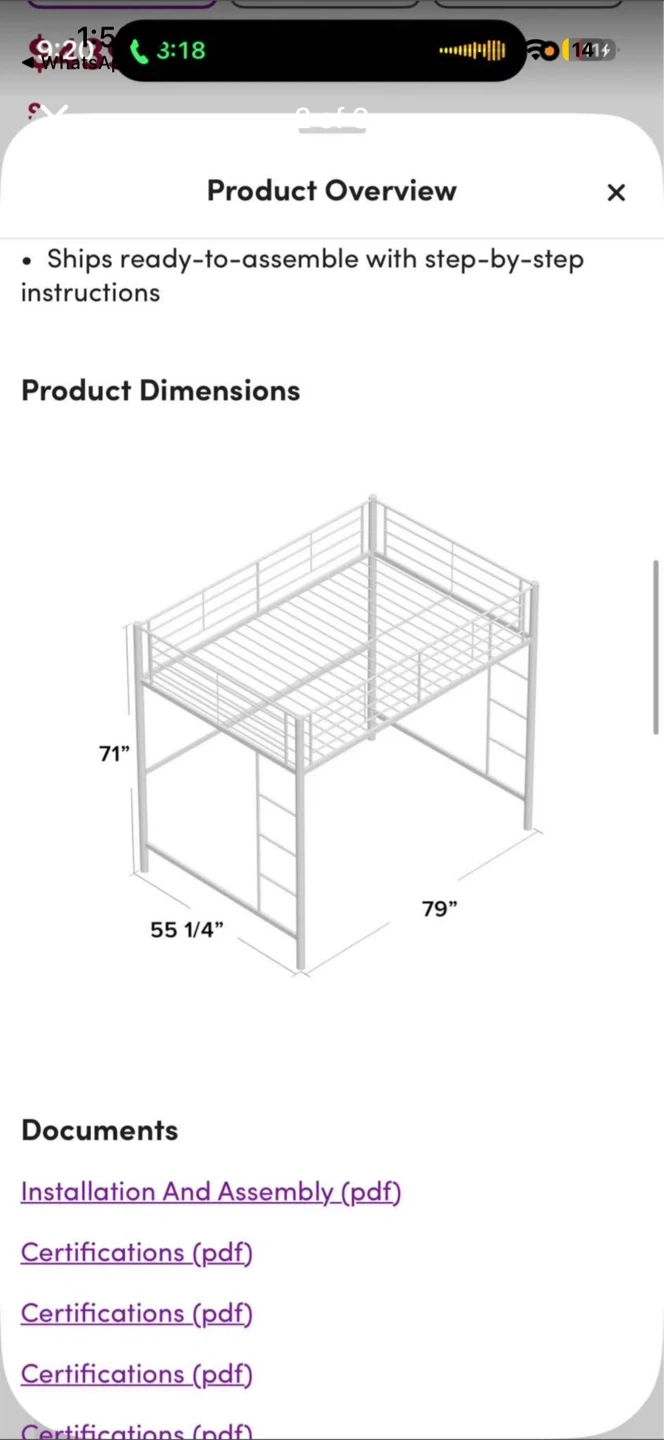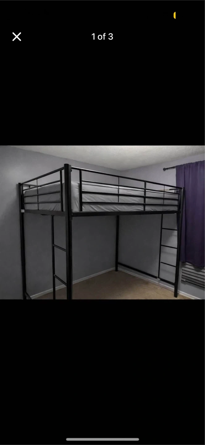 This Elita Kids Full Loft Bed is black metal. It measures 71 inches in height, 55 1/4 inches in width, and 79 inches in length. It ships ready-to-assemble with instructions.