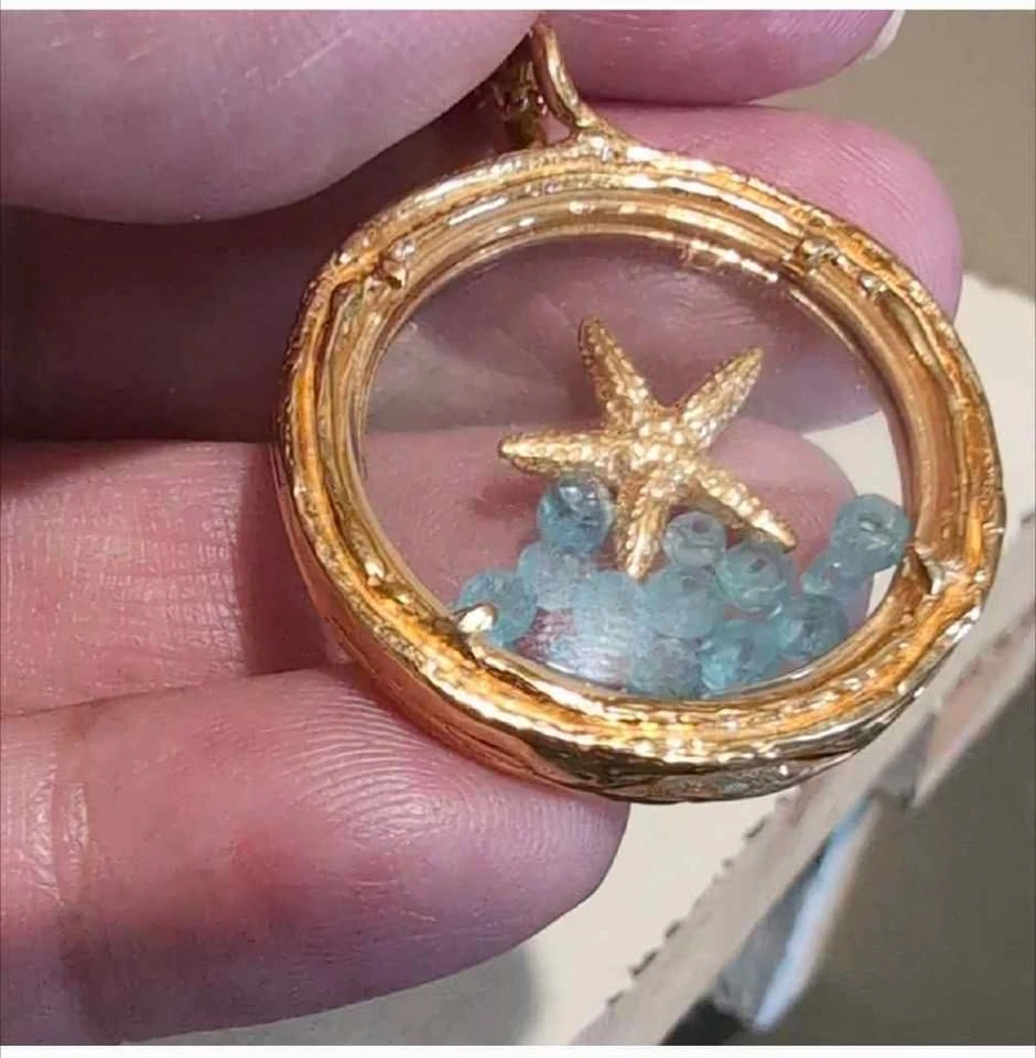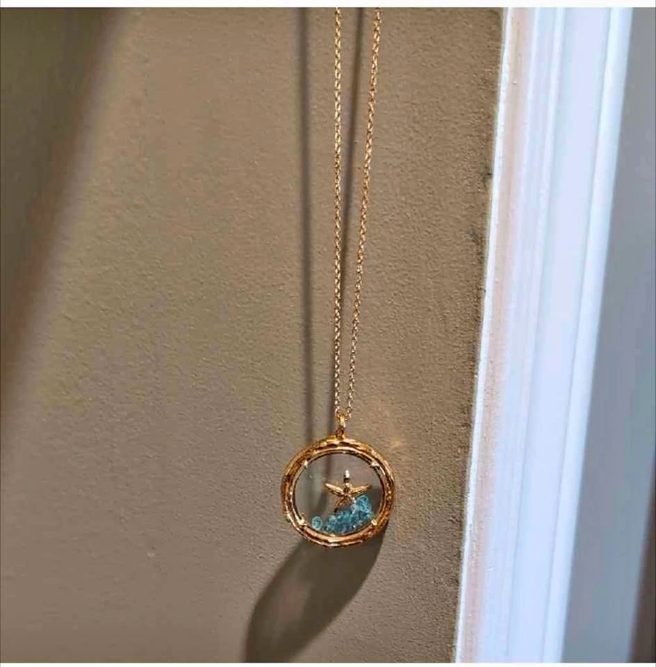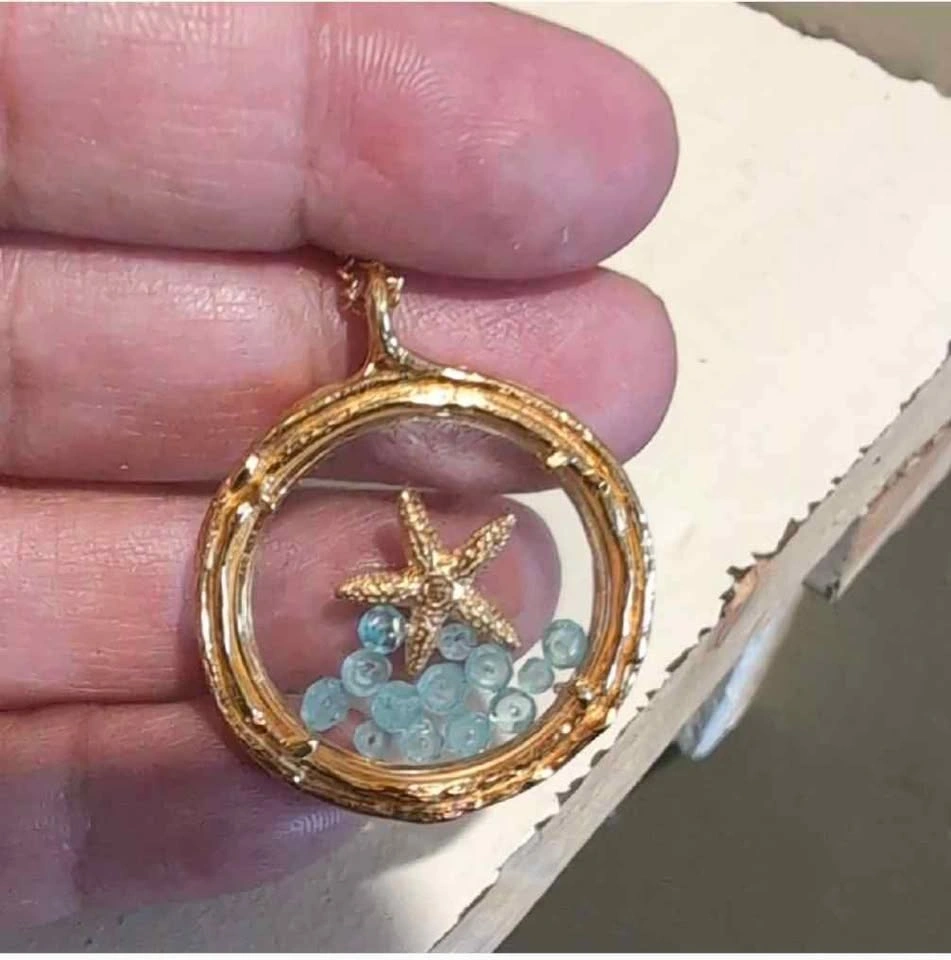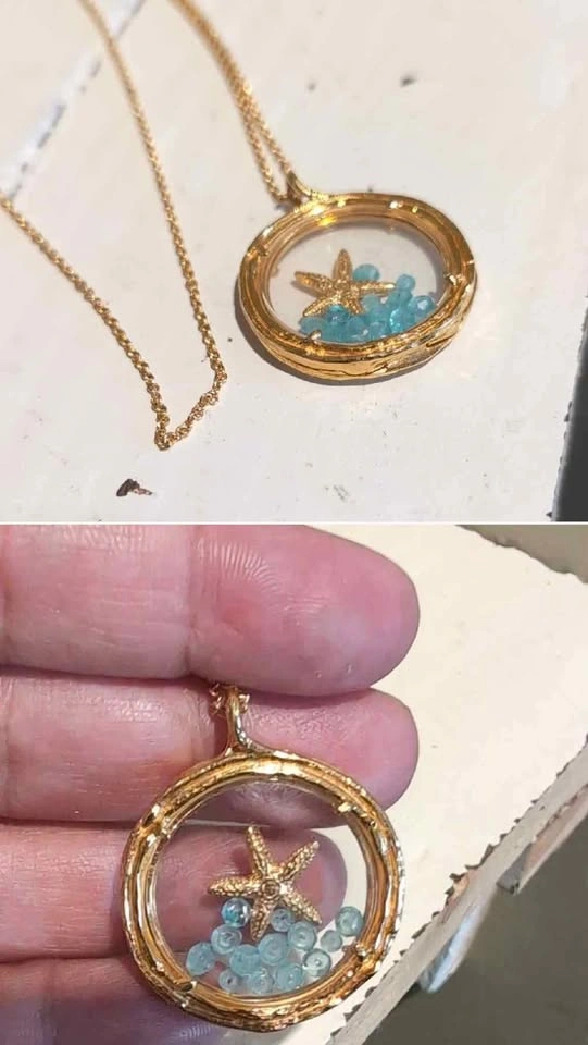 Charming gold locket necklace featuring a delicate starfish and vibrant blue accents. Cast from real branches. A perfect accessory for ocean lovers. Locket opens up so you can put in your own treasures.