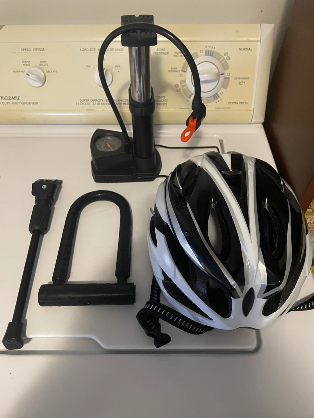 Selling a bike helmet, pump, kick stand and U-lock with holder on bike as a set. They're in good condition. Perfect for getting ready for bike rides.