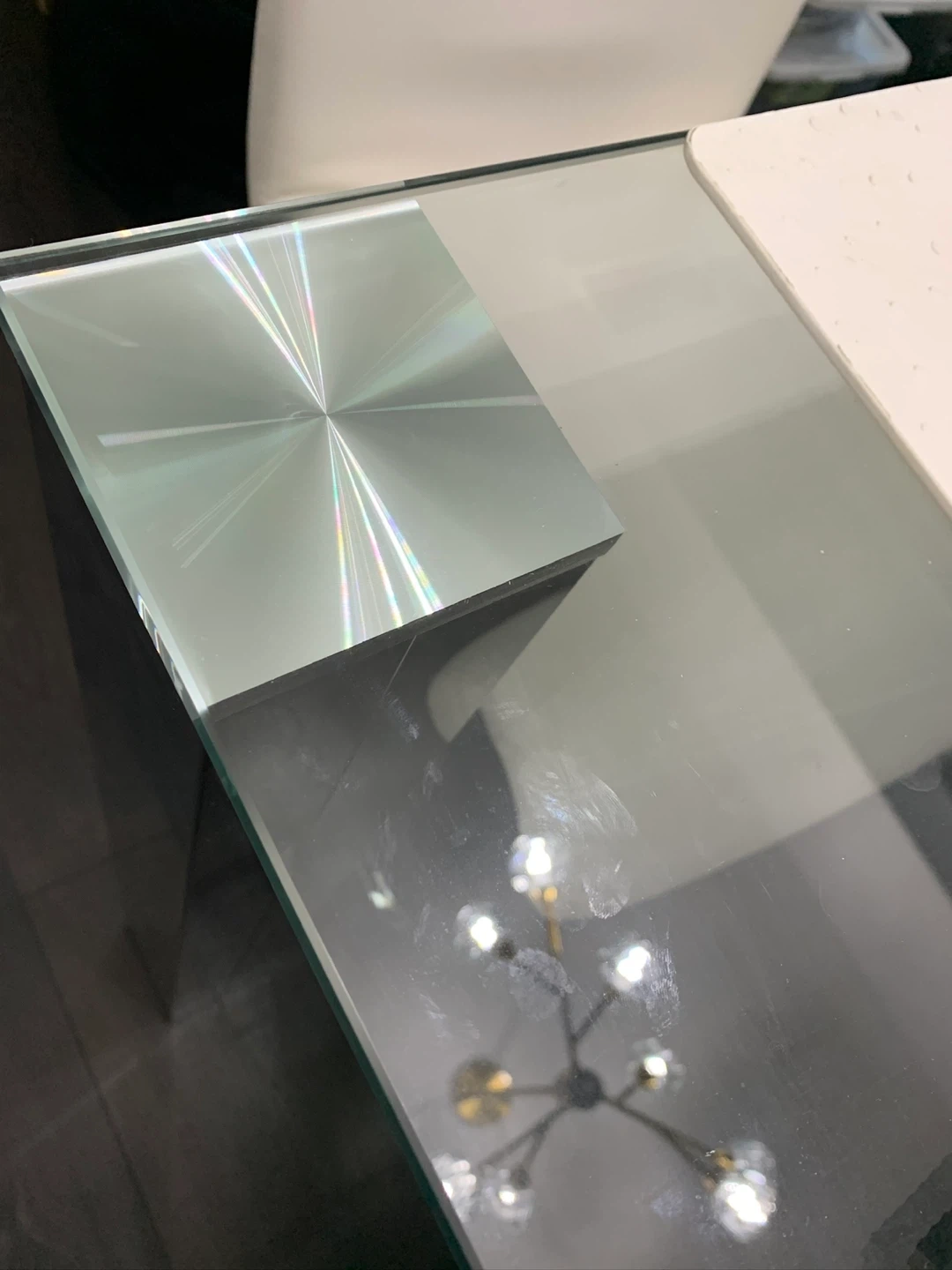 White glass table with 2 dinning chairs and bench