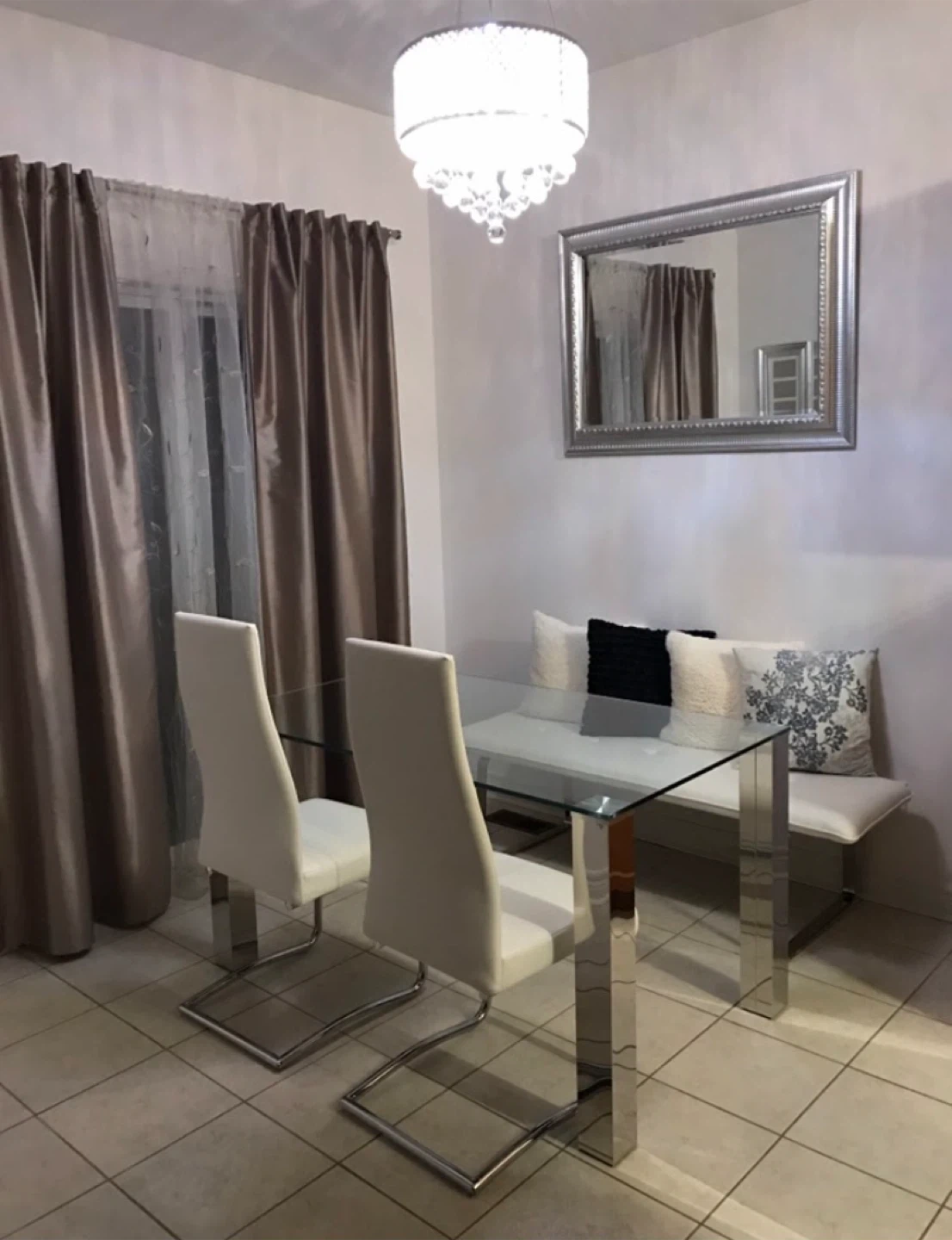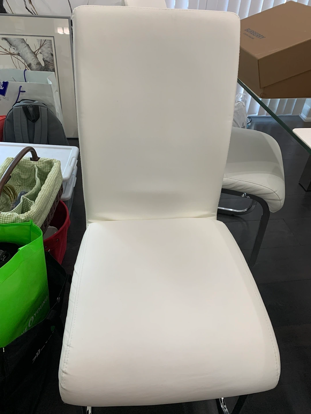 Selling a stylish white faux leather dining chairs and bench with glass table. It's in great shape and would look fantastic in any dining room! The modern design and clean lines make it a versatile piece for any home decor
