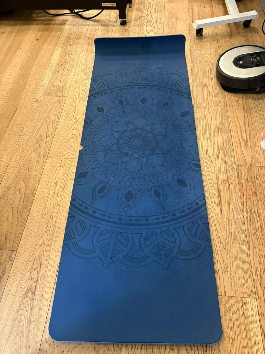A blue yoga mat featuring an intricate mandala design. It's made of a durable material for good grip during your practice. This mat is suitable for yoga, stretching, or general fitness exercises. Minor damaged but still has lots of life left.