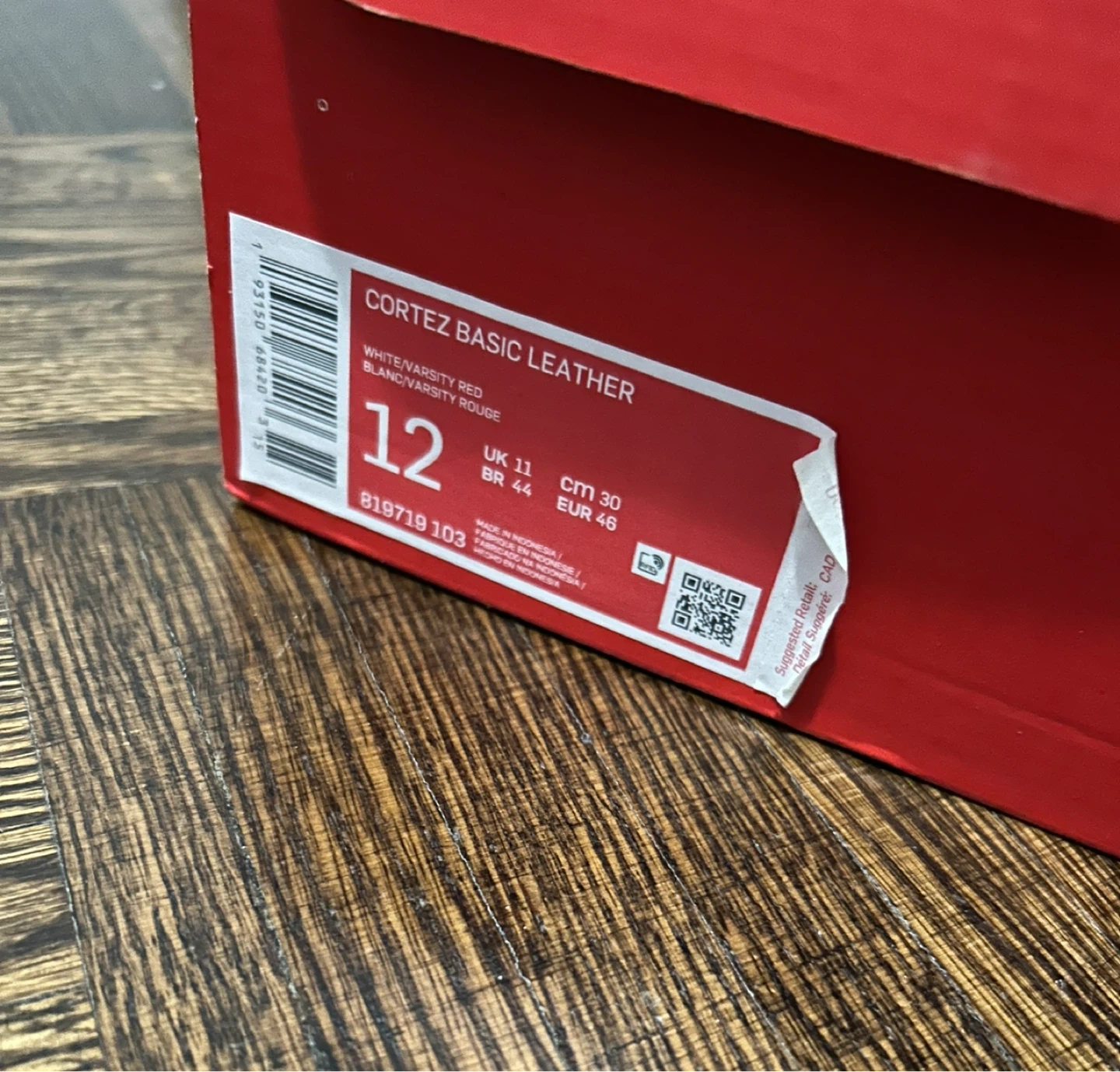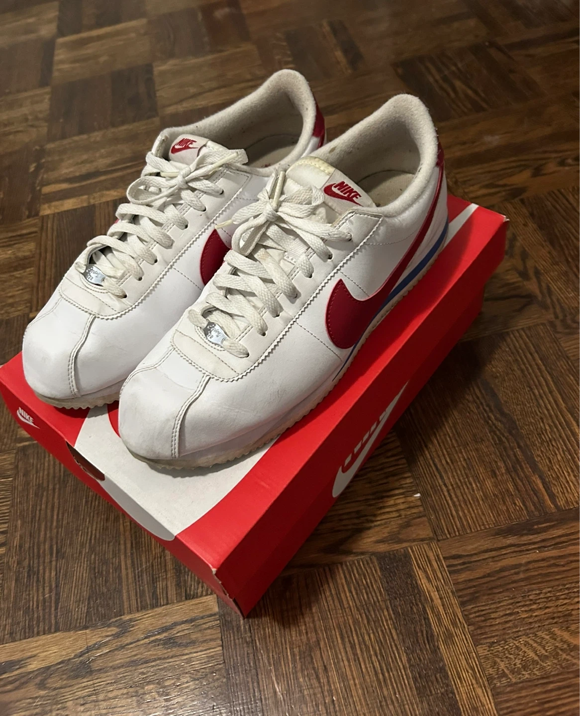 Nike Cortez Basic Leather sneakers in white and varsity red. They are a mens size 12 (Womens 13.5). Good condition, some scratches.