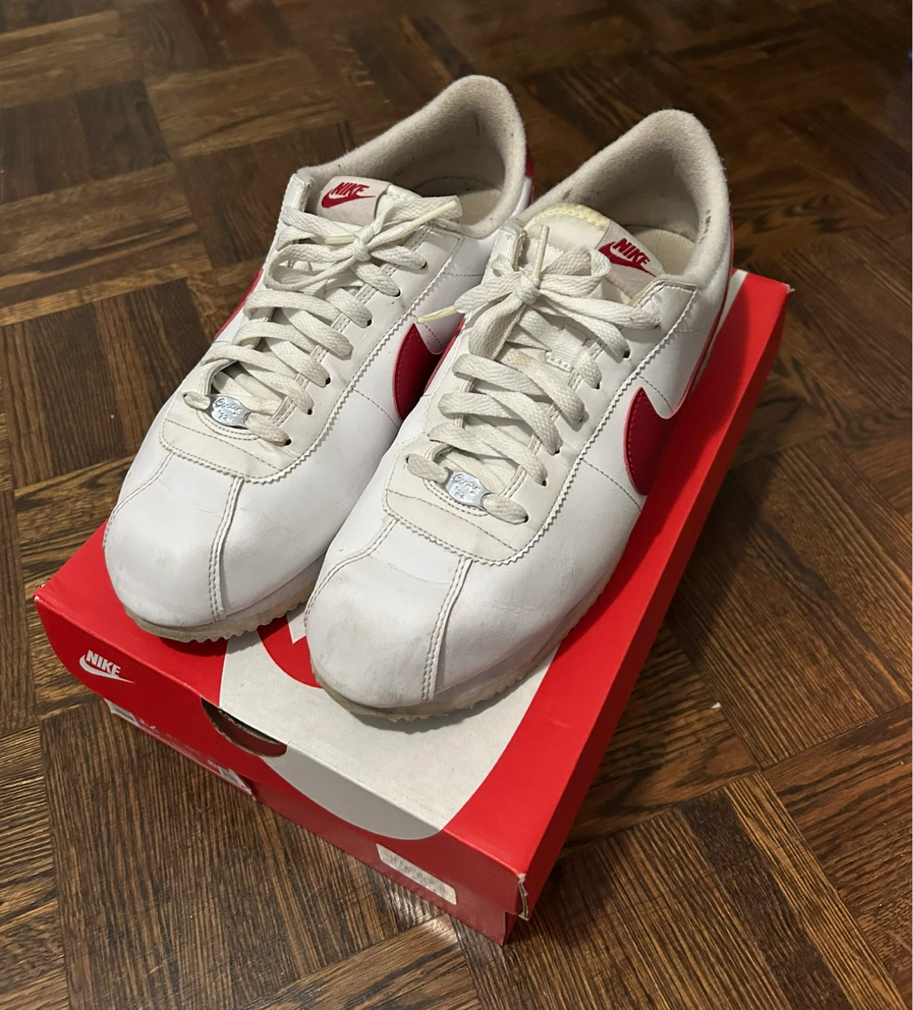 Nike Cortez Basic Leather sneakers in white and varsity red. They are a mens size 12 (Womens 13.5). Good condition, some scratches.