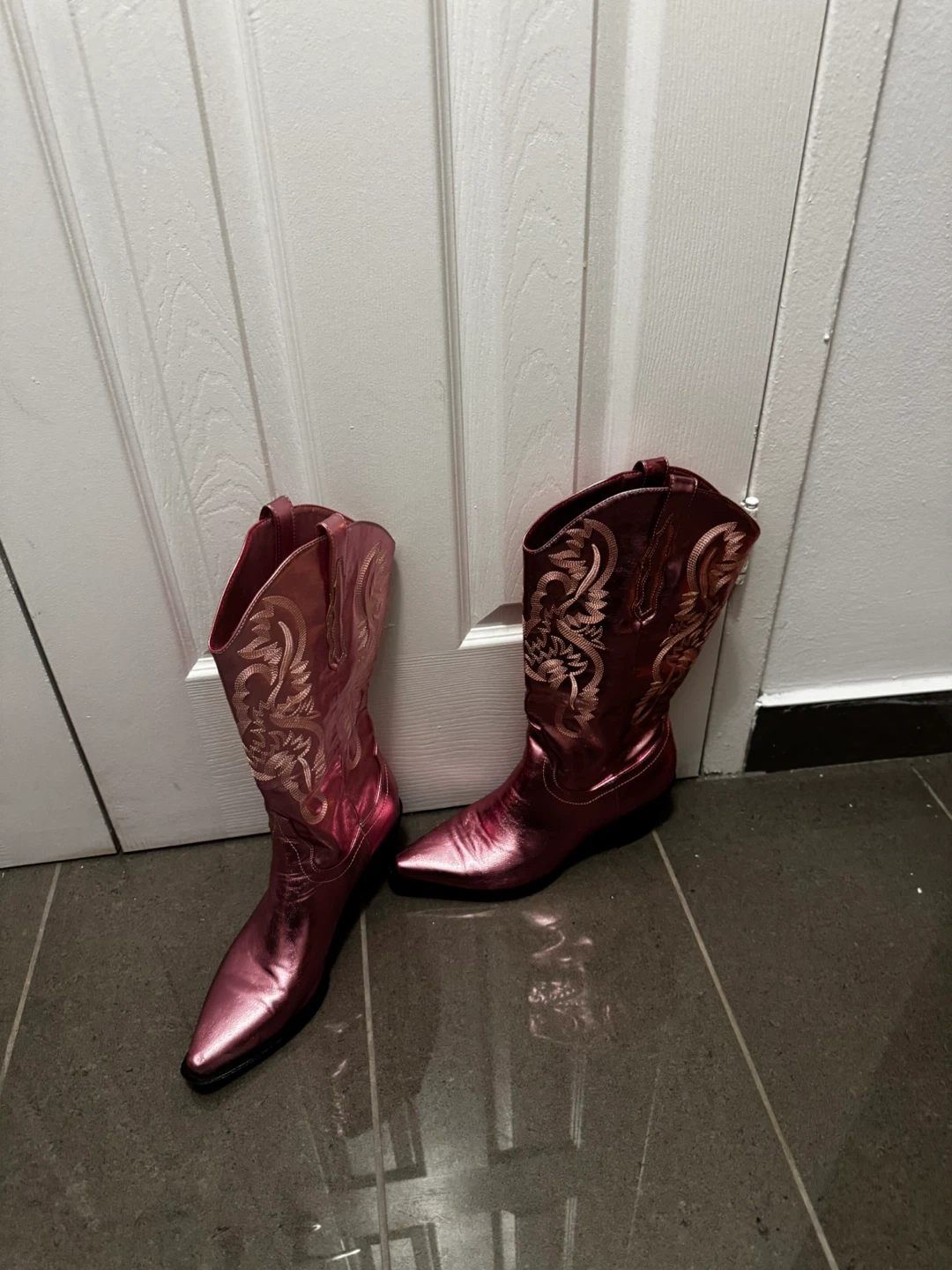 Shiny metallic pink cowboy boots with ornate western-style stitching. These boots have a classic cowboy silhouette with a pointed toe and a stacked heel. They're perfect for adding a pop of colour and flair to any outfit!