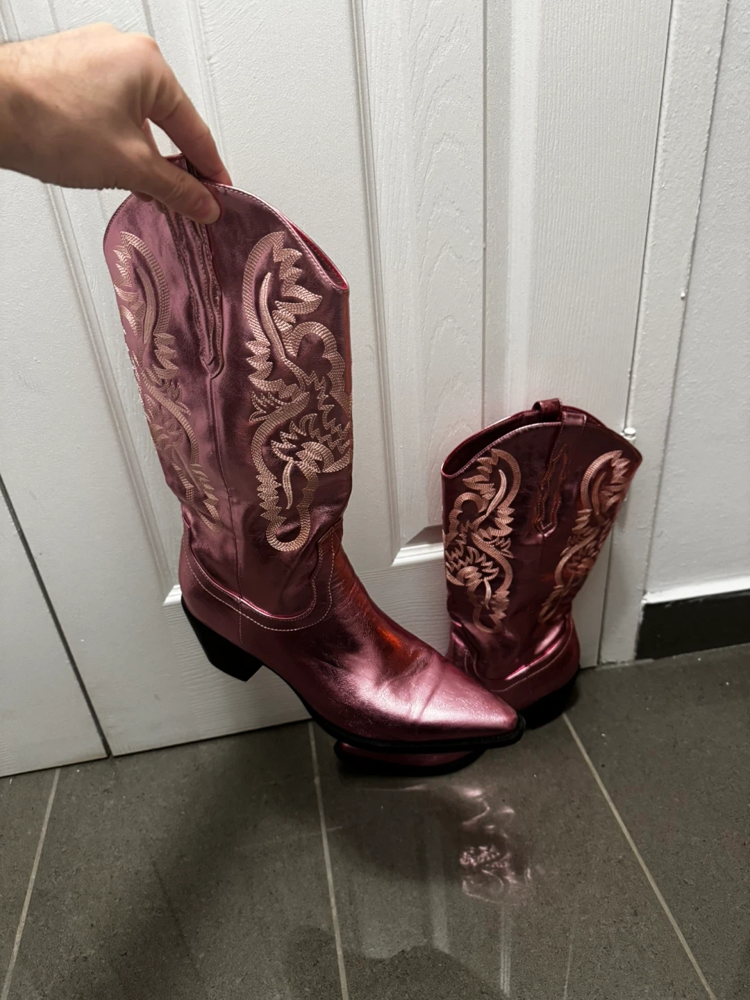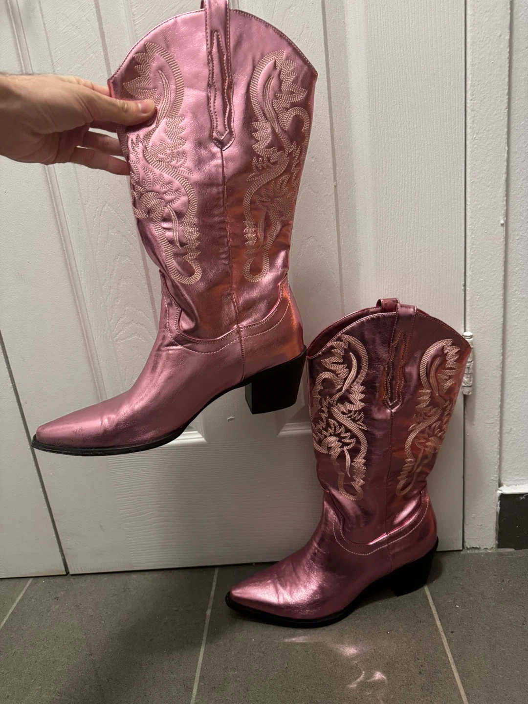 Shiny metallic pink cowboy boots with ornate western-style stitching. These boots have a classic cowboy silhouette with a pointed toe and a stacked heel. They're perfect for adding a pop of colour and flair to any outfit!