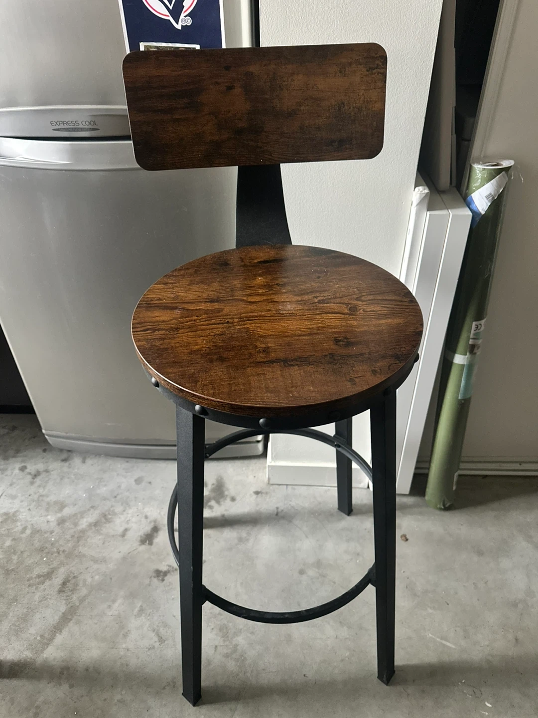 Rustic bar stool. Has a dark wood-look seat and back. Black metal frame with footrest. Super sturdy.