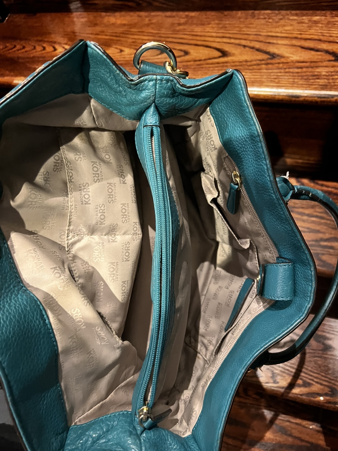 Selling a beautiful Michael Kors teal leather tote bag! It's in great condition and features gold-tone hardware and chain detailing. The interior is spacious with multiple compartments to keep your belongings organized. Perfect for everyday use or a stylish night out!
