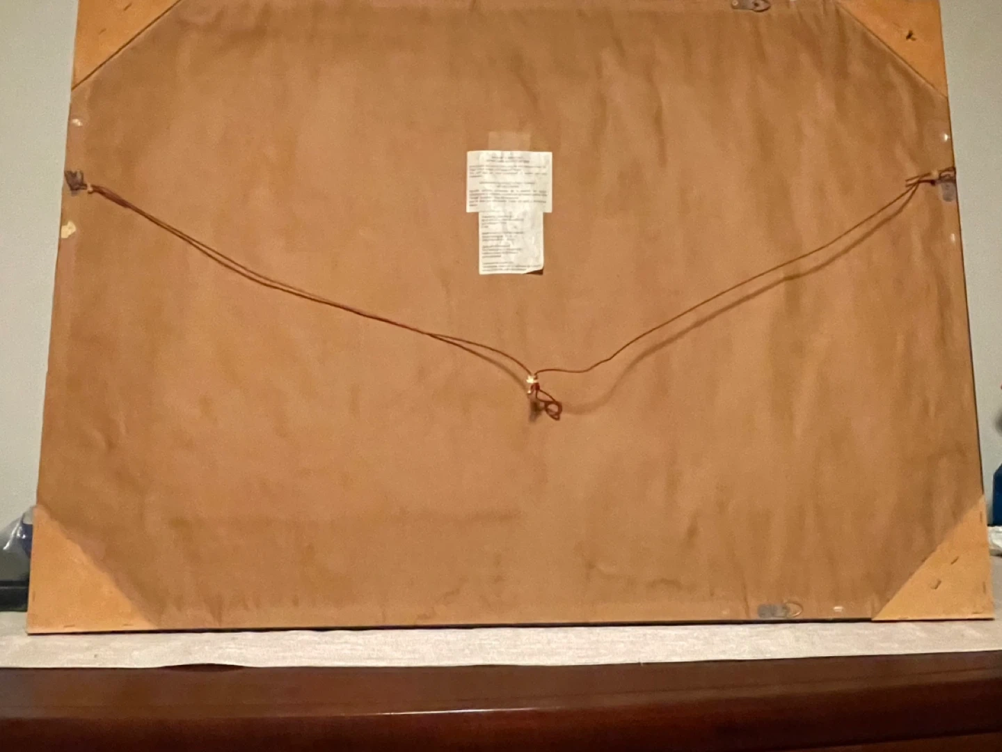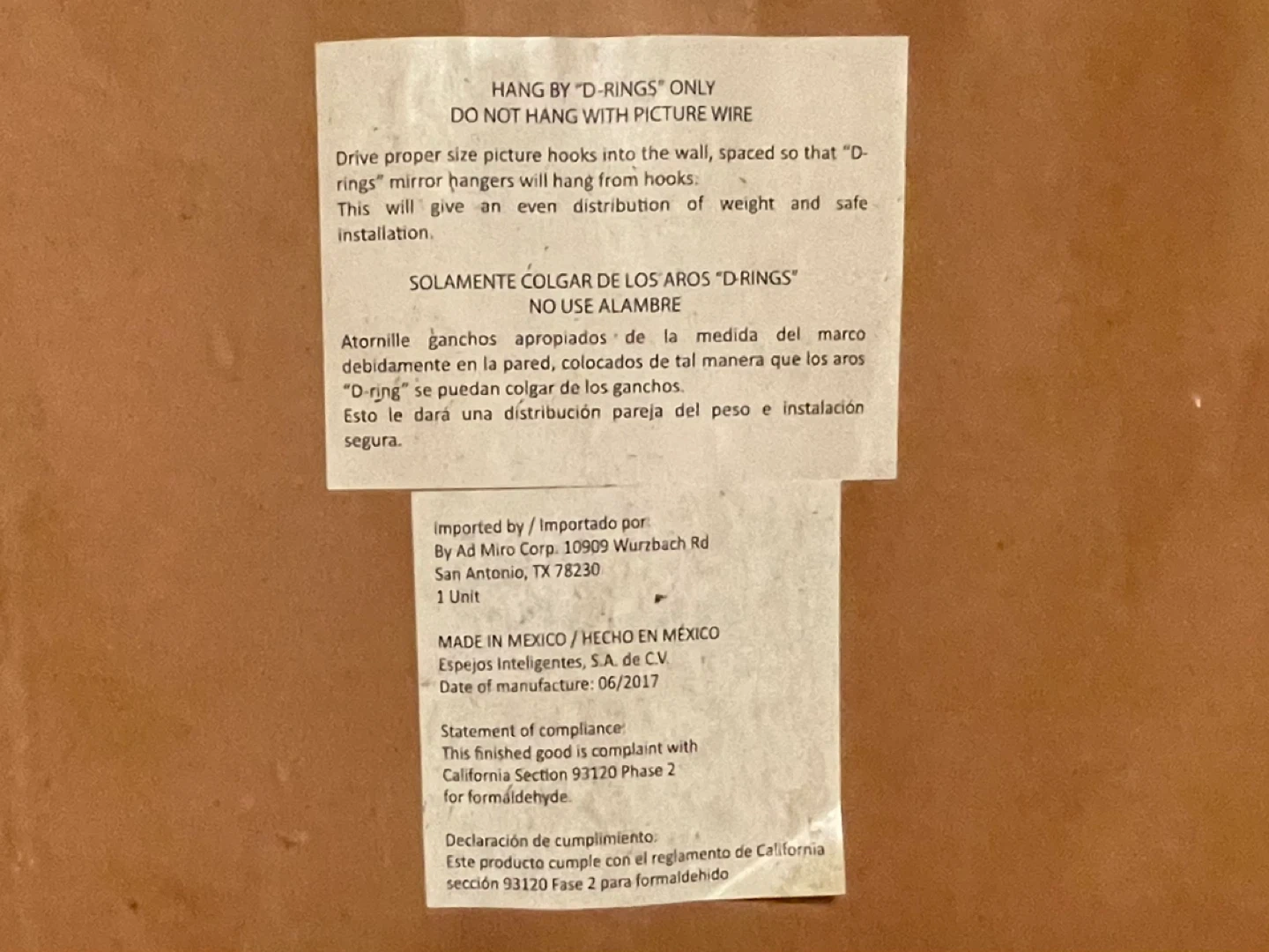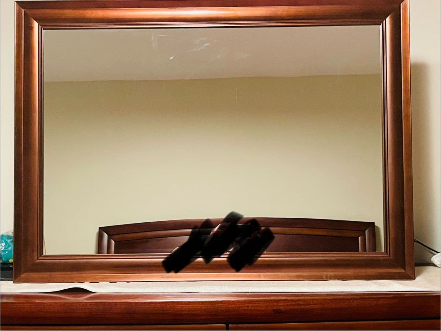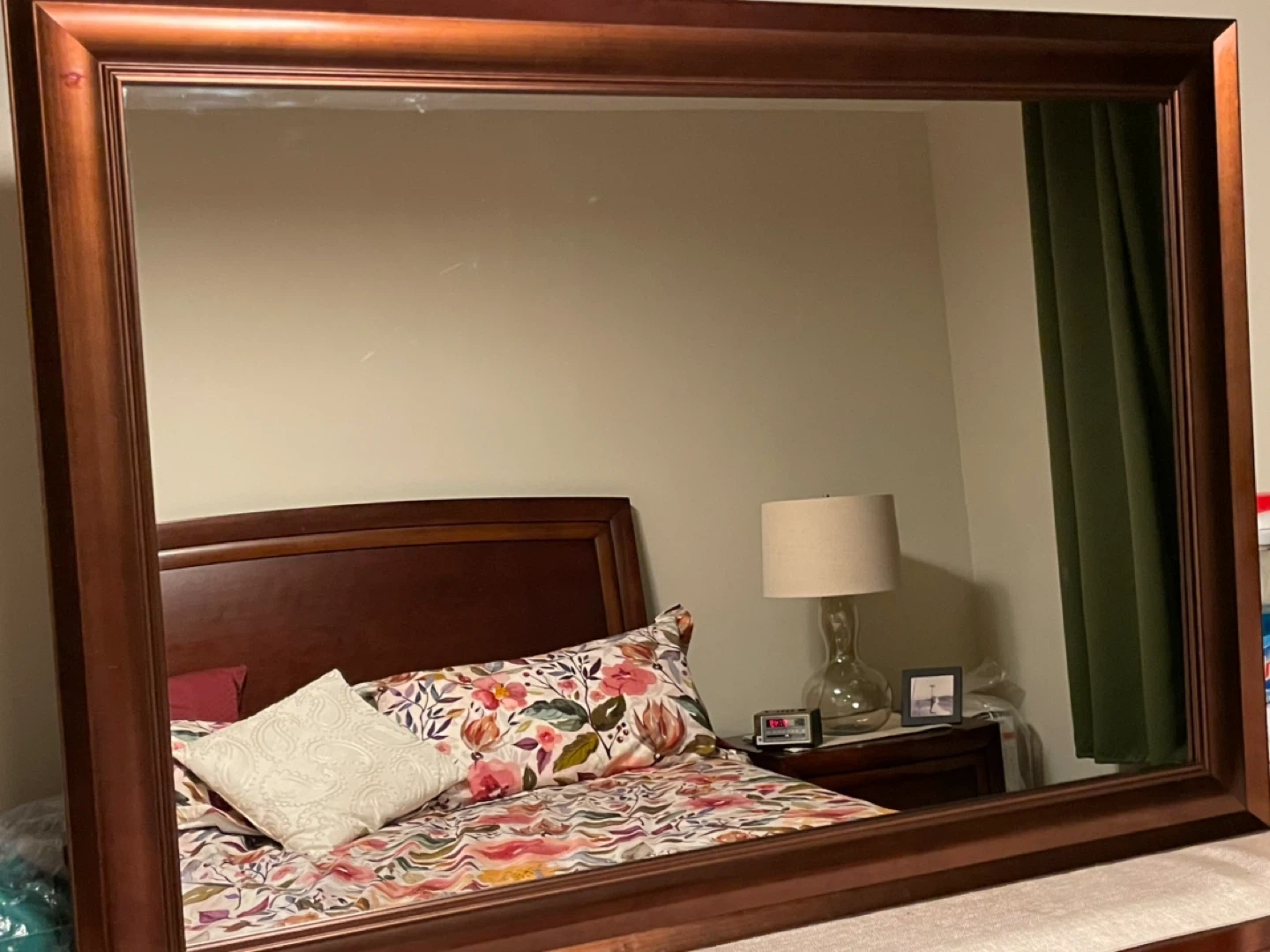 This is a large decorative wall mirror. It has a wooden frame with a dark stain finish. It's ready to hang!42”x30”