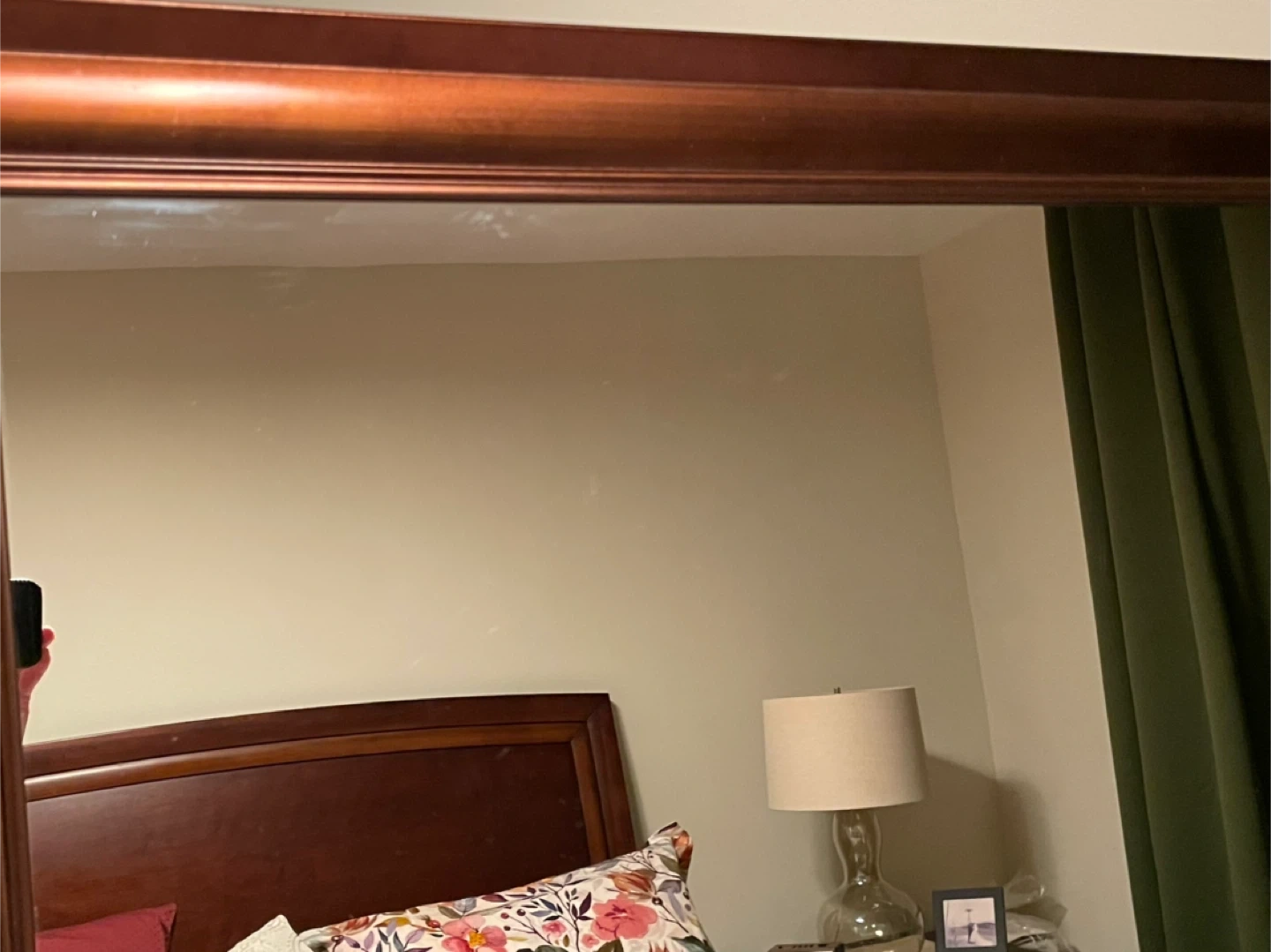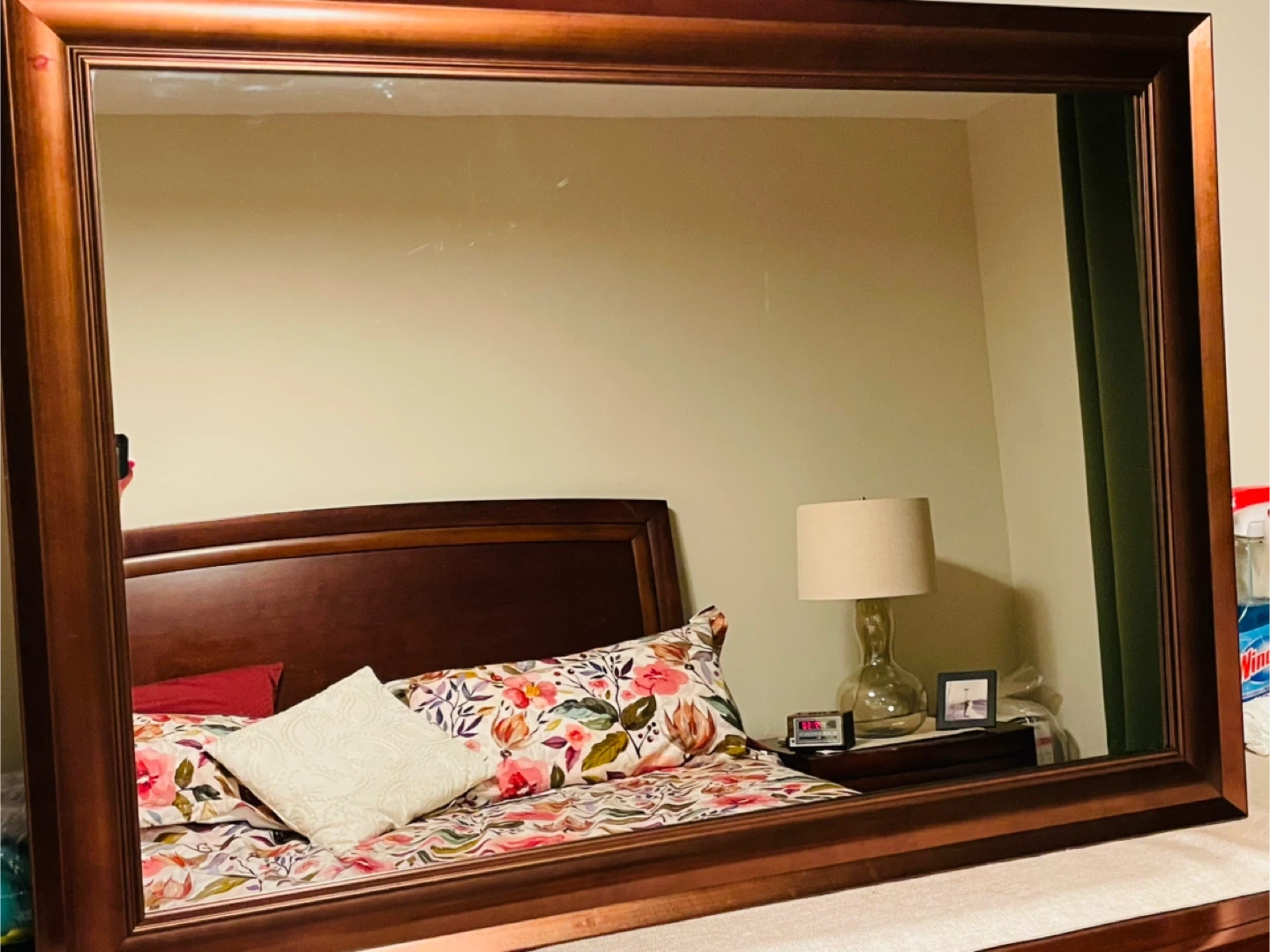 This is a large decorative wall mirror. It has a wooden frame with a dark stain finish. It's ready to hang!42”x30”
