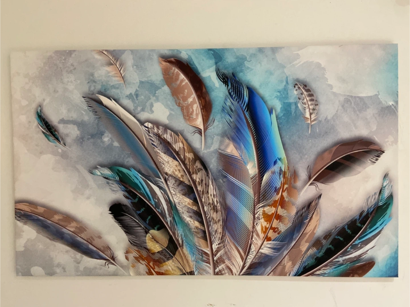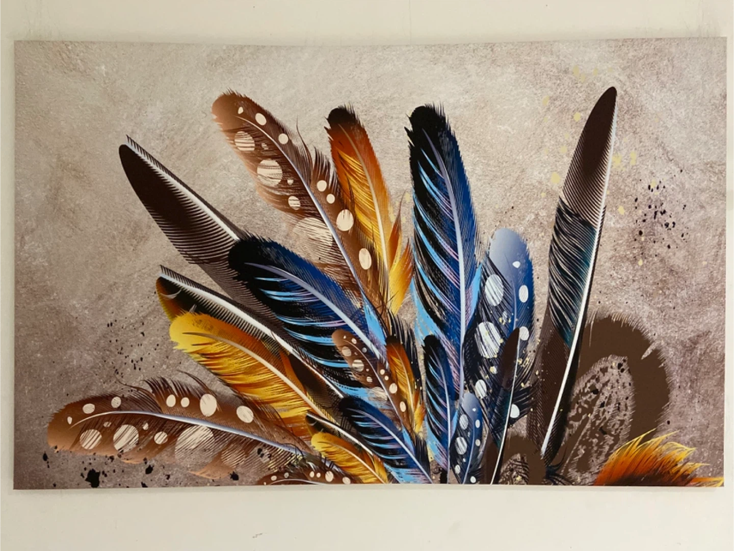 This canvas print features a beautiful arrangement of colourful feathers. It's a vibrant piece that adds a touch of nature's artistry to any room.