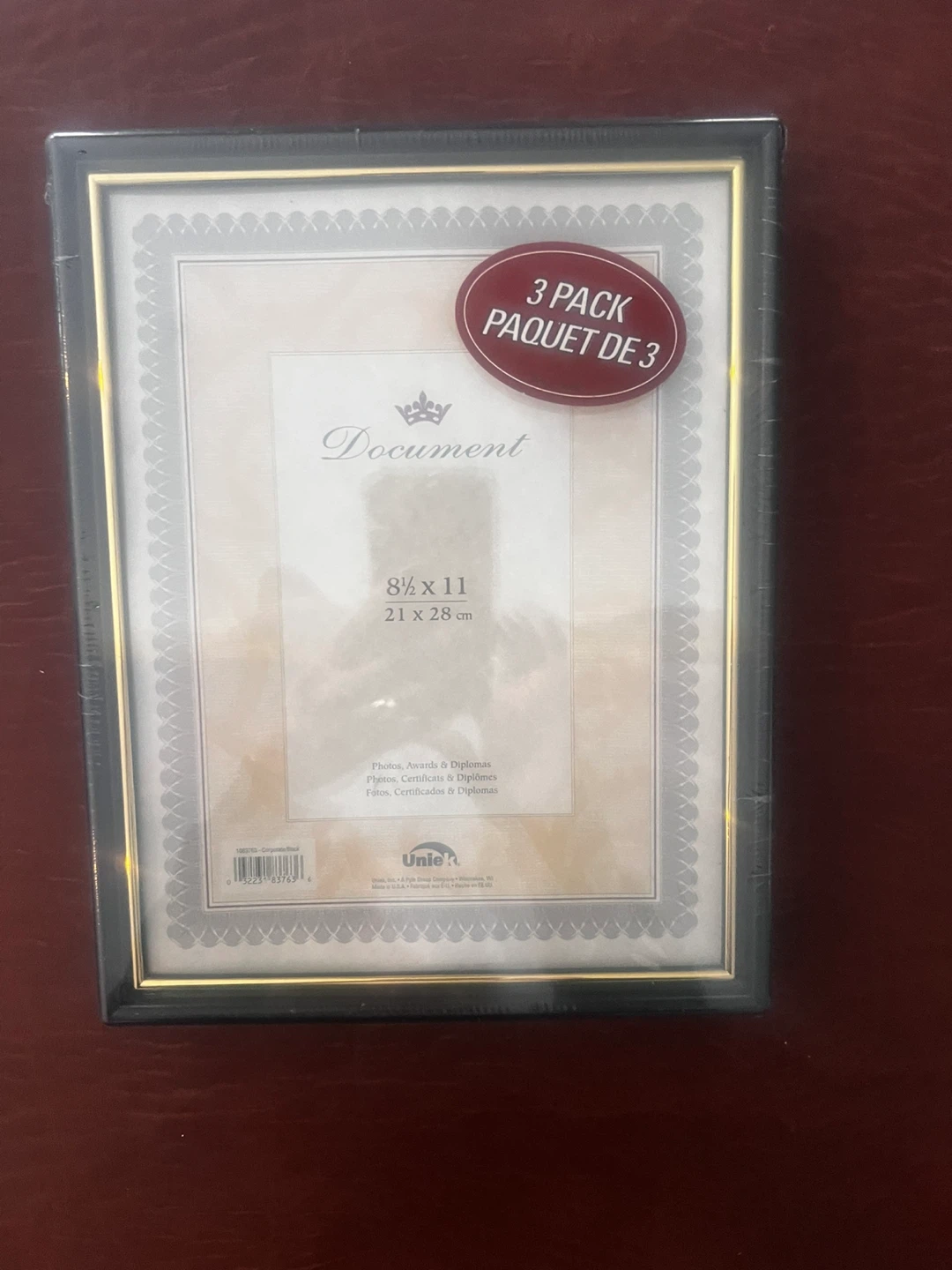 This is a 3 pack of Unie document frames. Each frame is 8.5" by 11" (21 x 28 cm). It's perfect for photos, certificates, and diplomas. The frames are black with a gold accent.