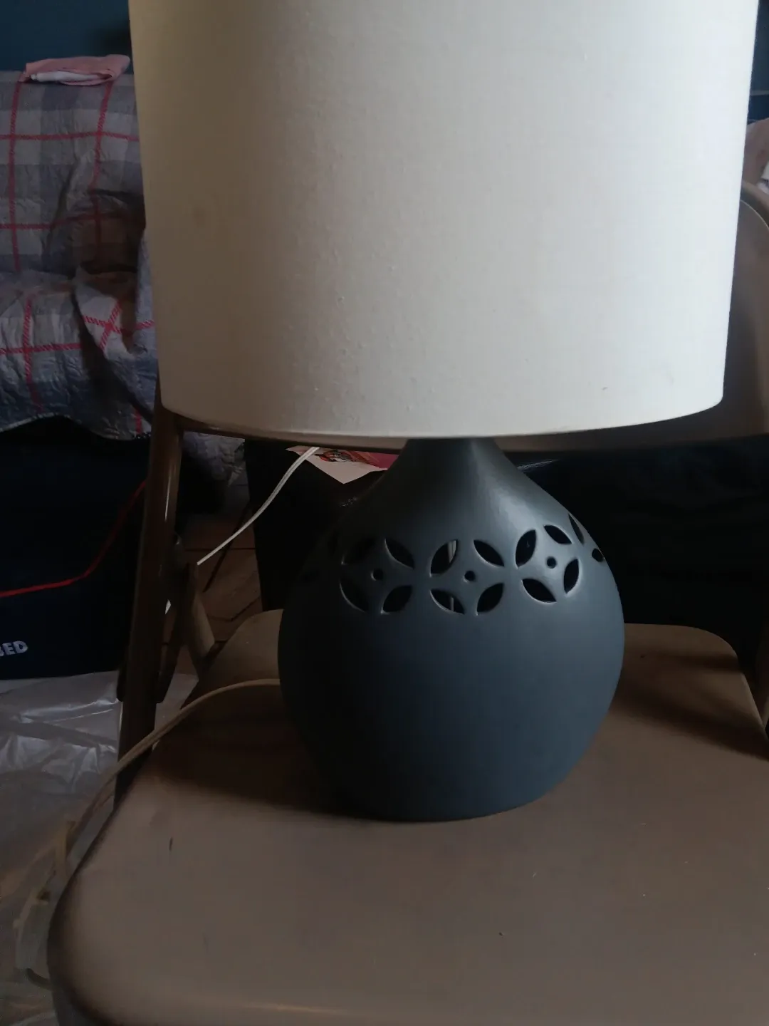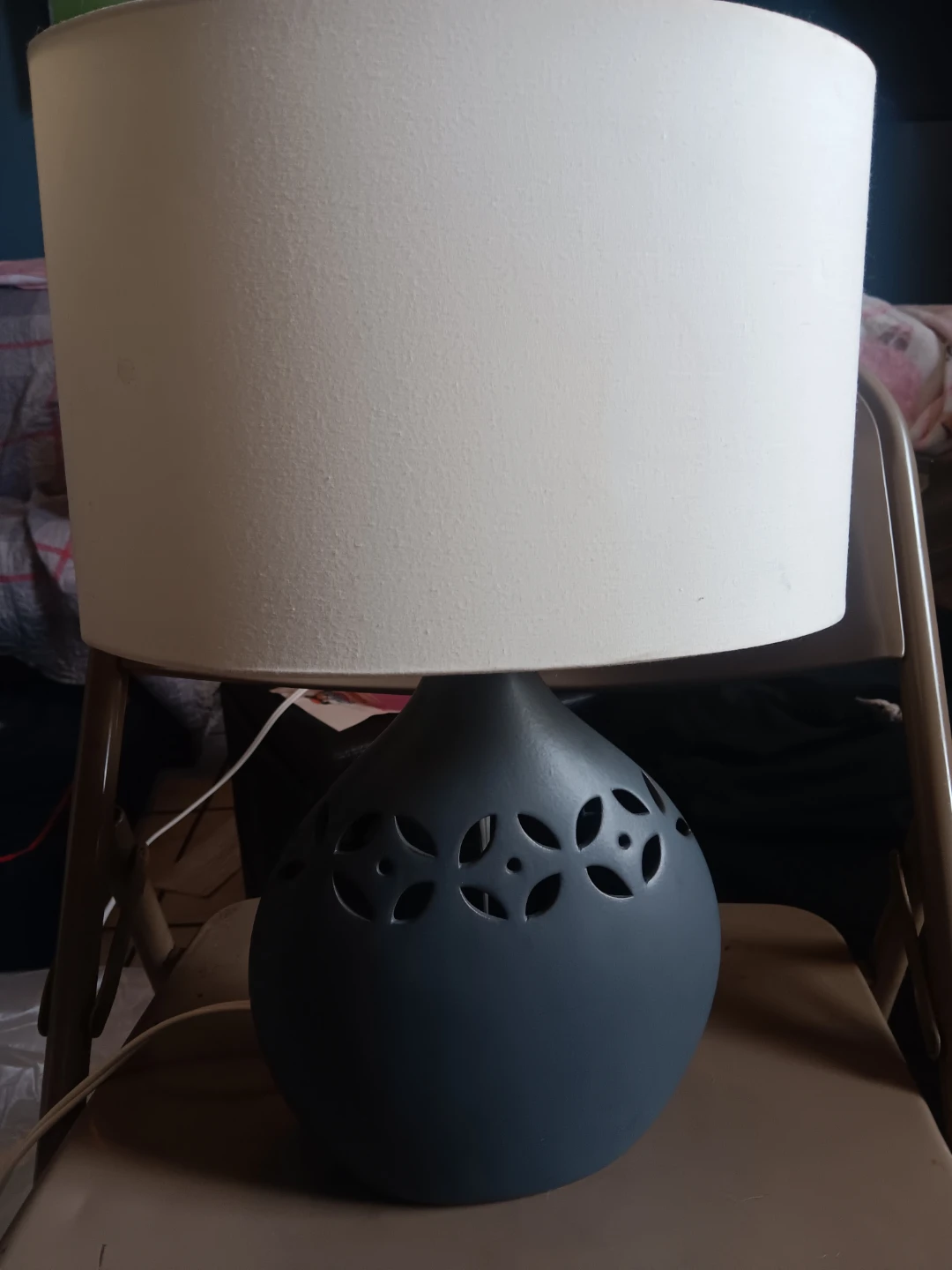 This table lamp features a distinctive cutout design on its gray ceramic base. It has a classic drum-shaped shade. It's a decorative piece that adds ambiance to any room.