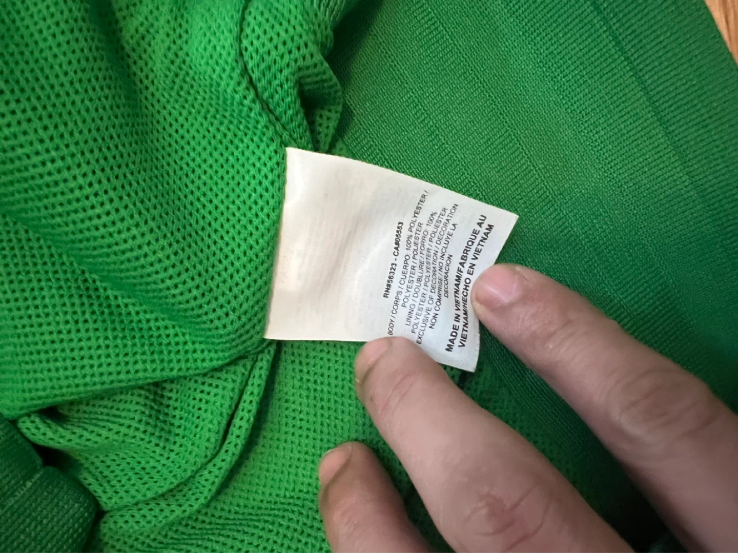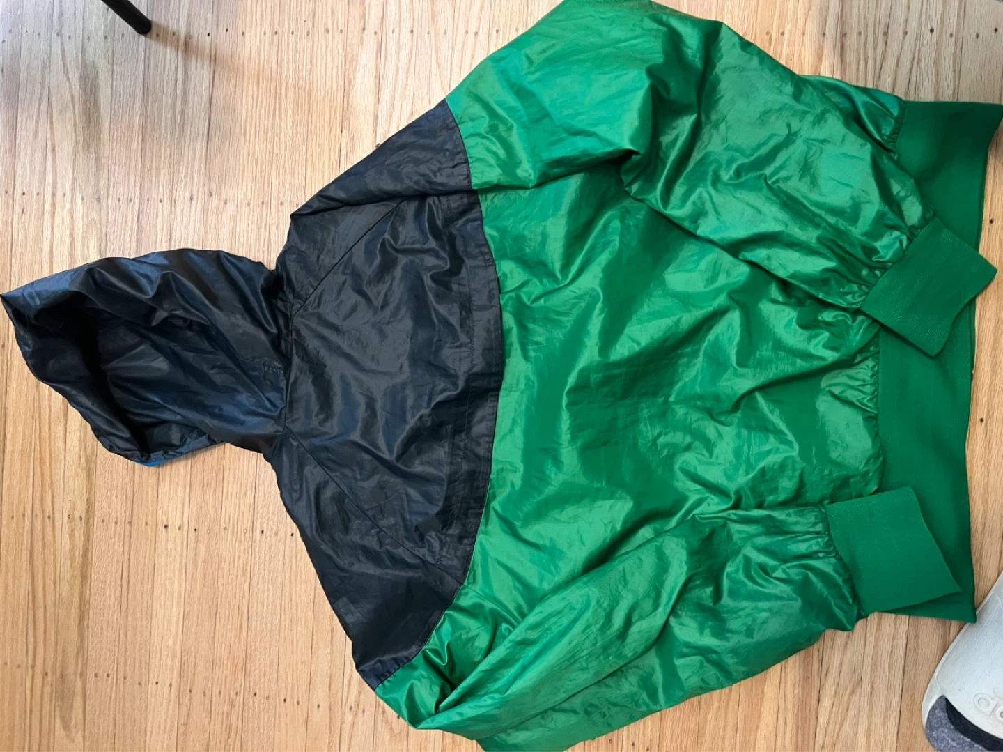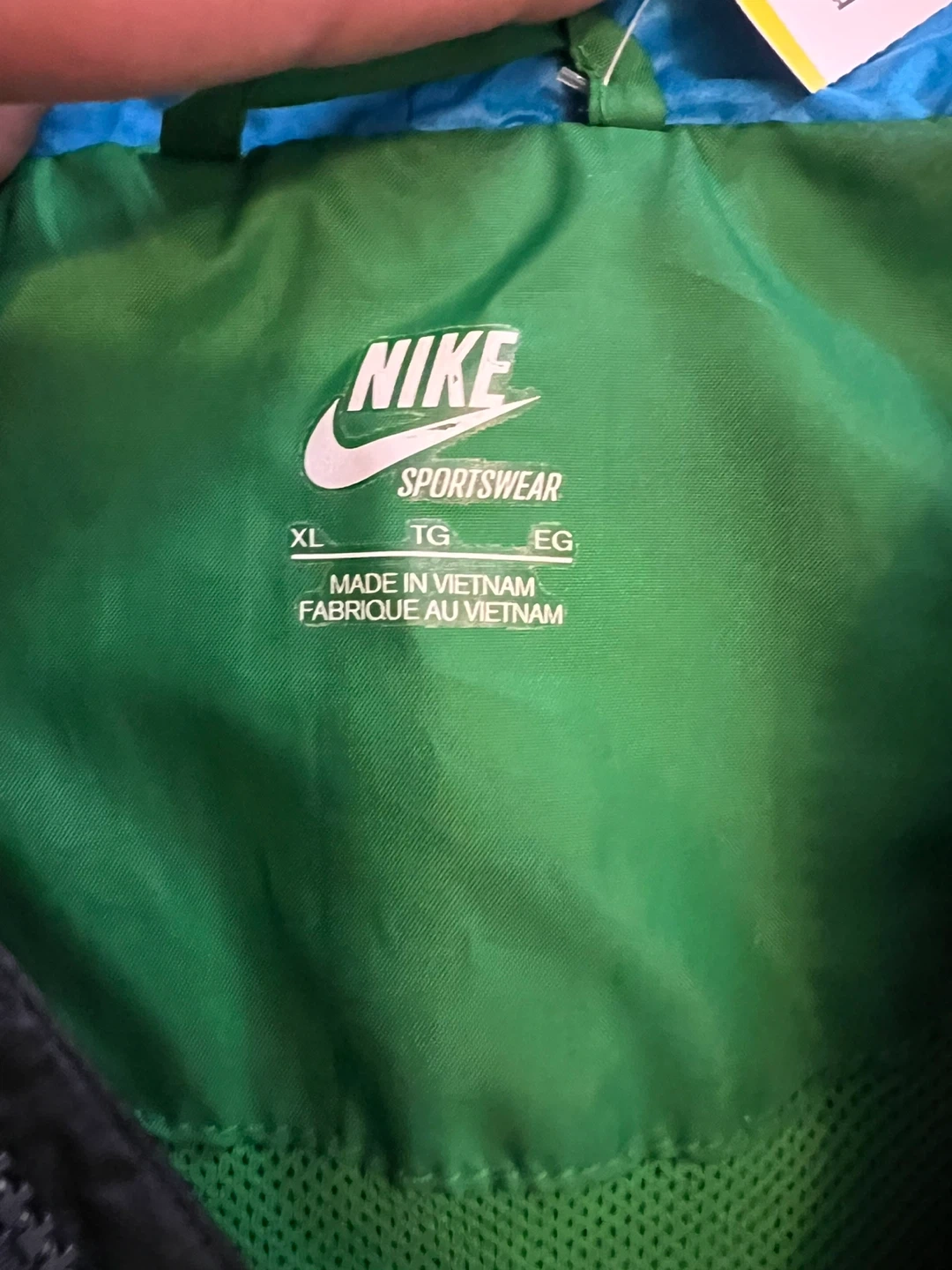 This is a Nike Sportswear Windrunner jacket in size XL. It's black and green with a blue lining. Made of 100% polyester.