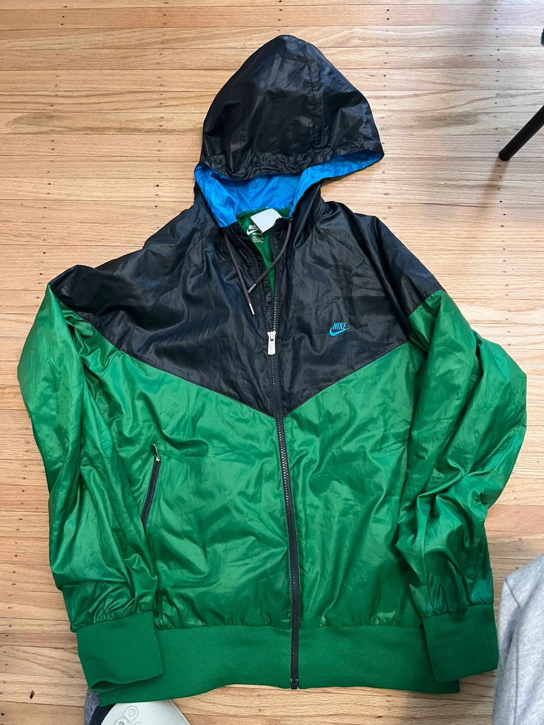 This is a Nike Sportswear Windrunner jacket in size XL. It's black and green with a blue lining. Made of 100% polyester.