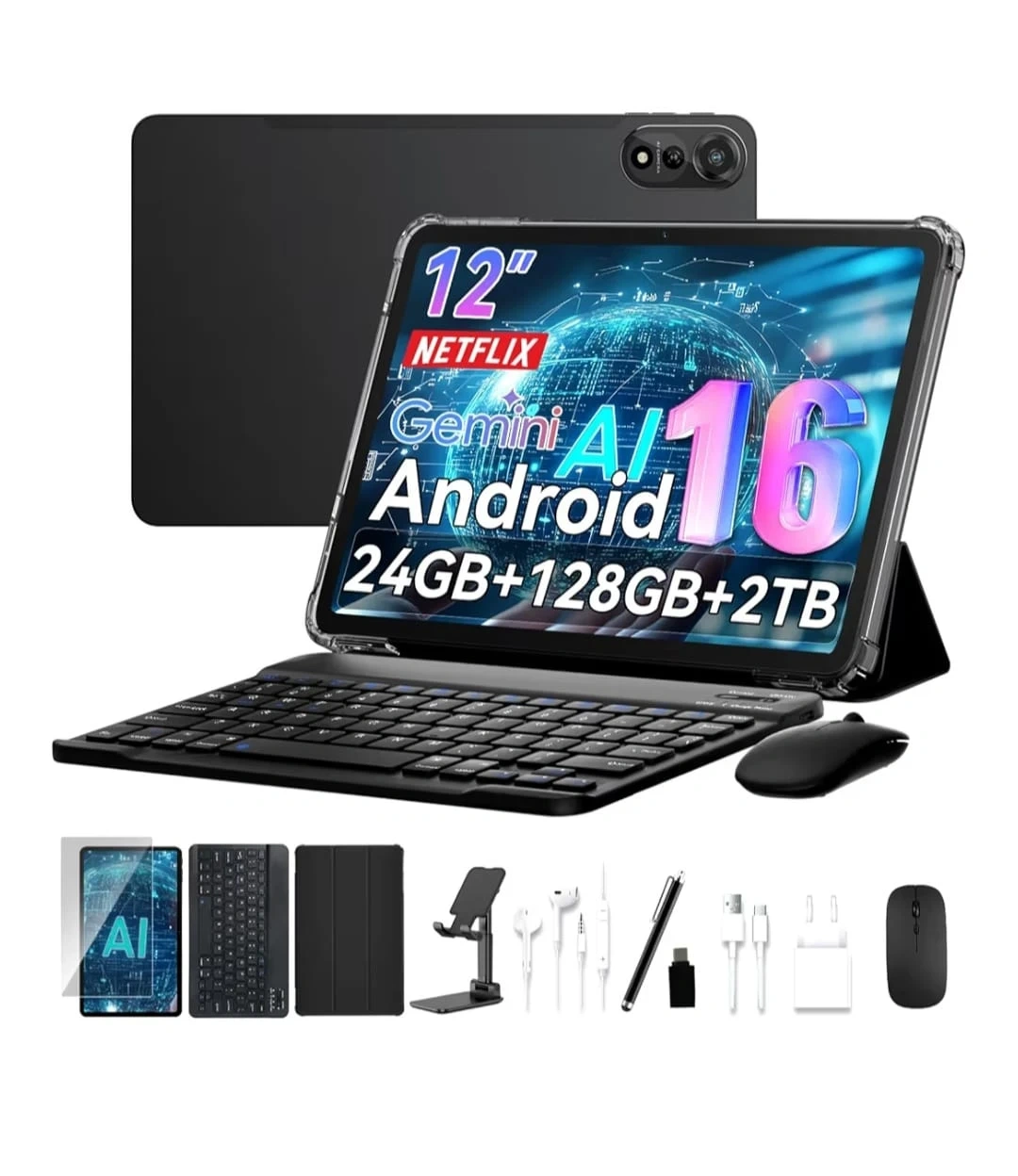 This Gemini AI tablet features a 12-inch screen and runs on Android. It comes with 24GB of RAM and 128GB of internal storage, expandable up to 2TB. The package includes a keyboard, mouse, screen protector, stand, and charger.