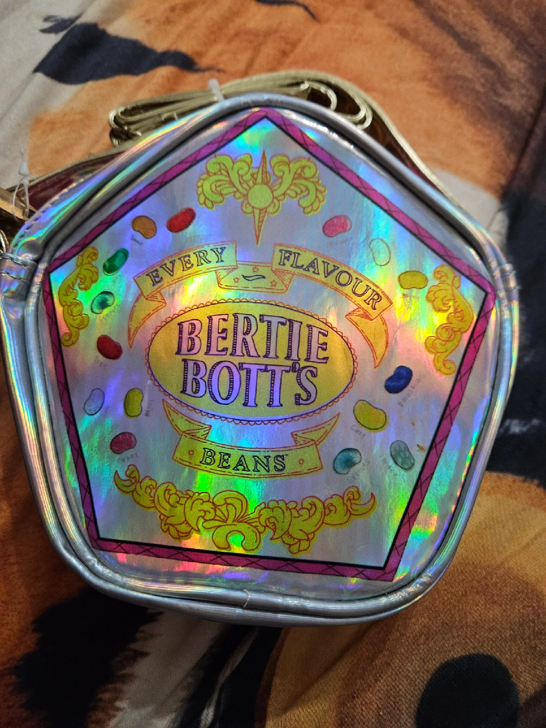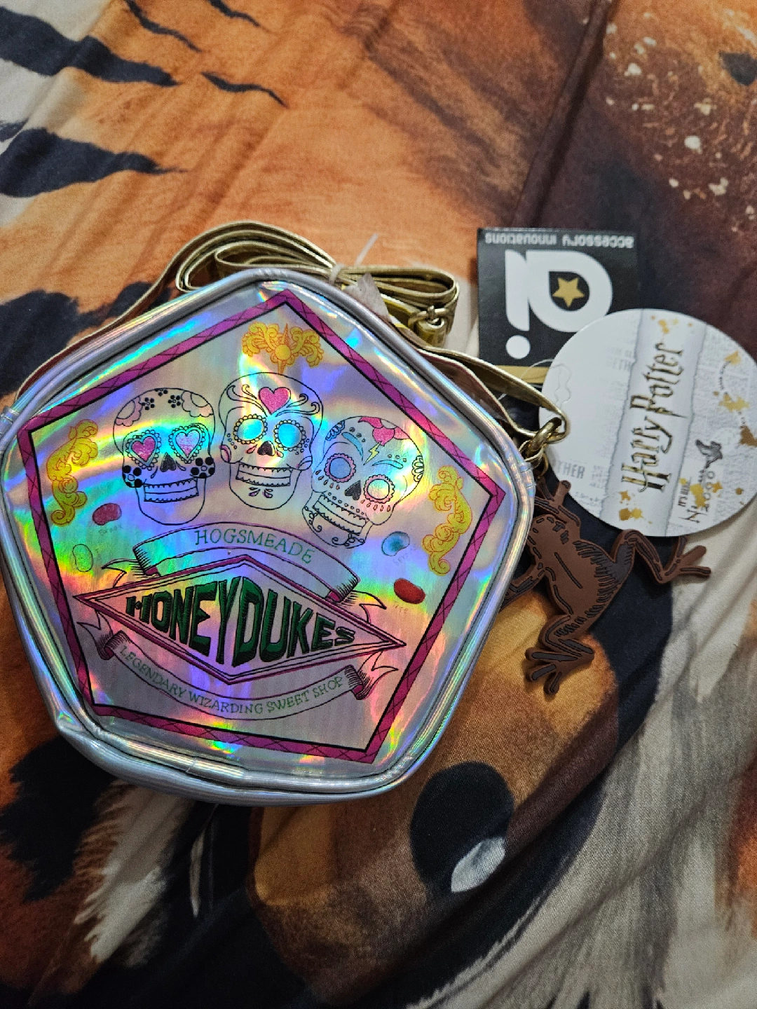 Selling a cute Harry Potter themed crossbody bag! It has a Bertie Bott's Every Flavour Beans design on one side and a Honeydukes design on the other. Comes with a frog keychain and tag. Perfect for any Harry Potter fan!