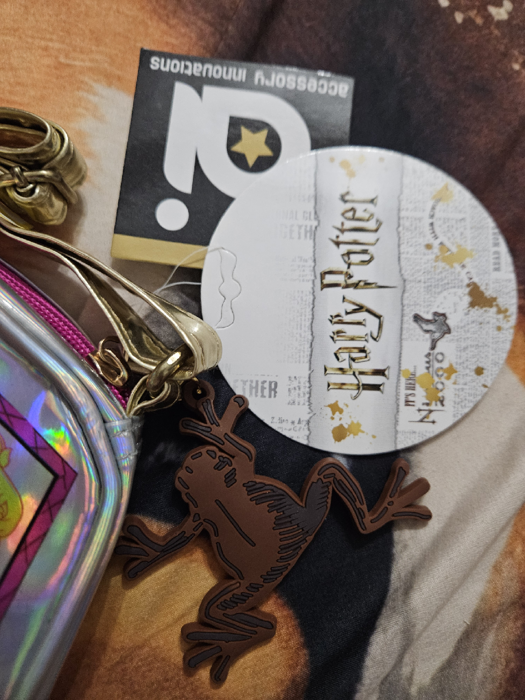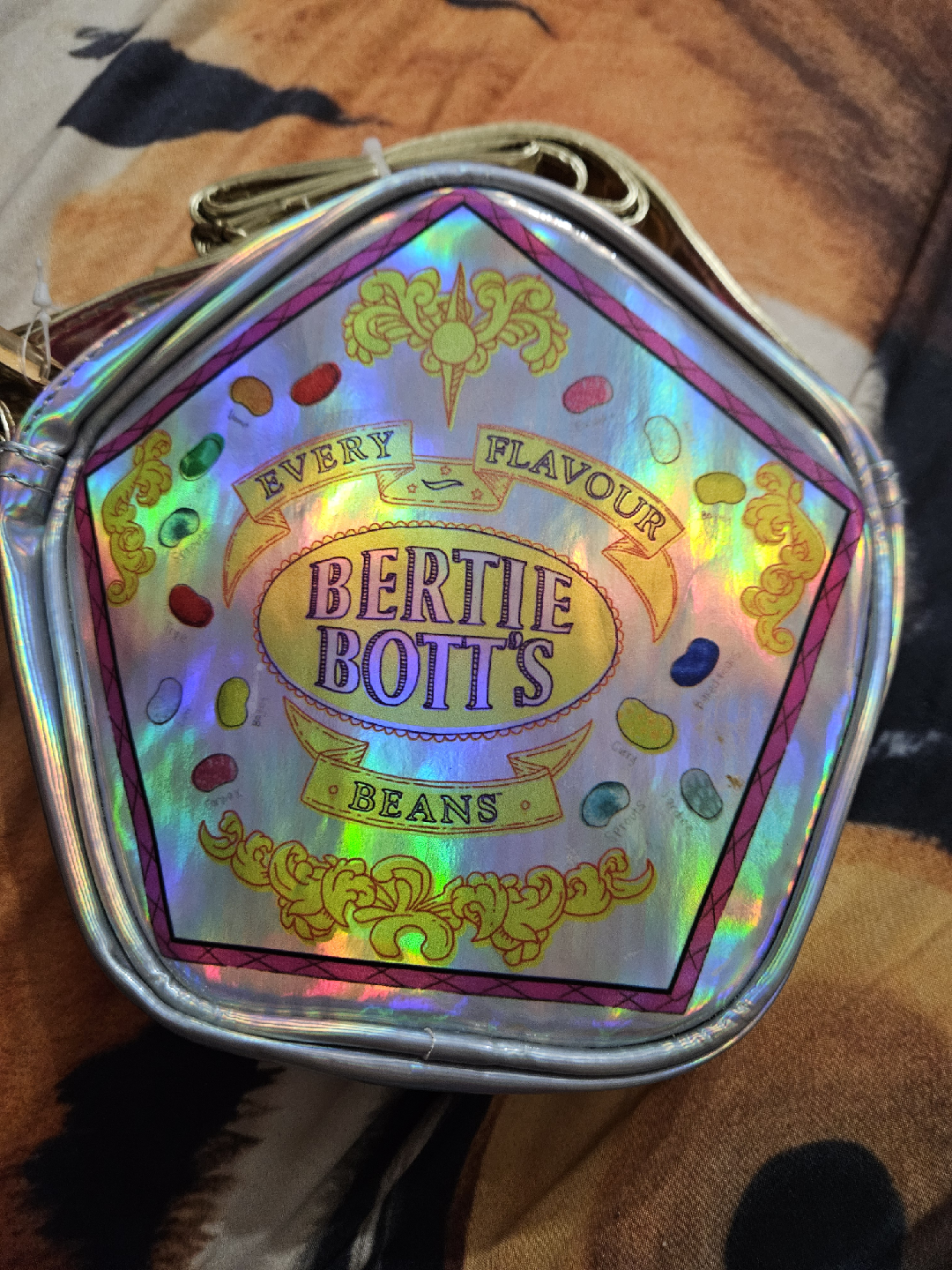 Selling a cute Harry Potter themed crossbody bag! It has a Bertie Bott's Every Flavour Beans design on one side and a Honeydukes design on the other. Comes with a frog keychain and tag. Perfect for any Harry Potter fan!