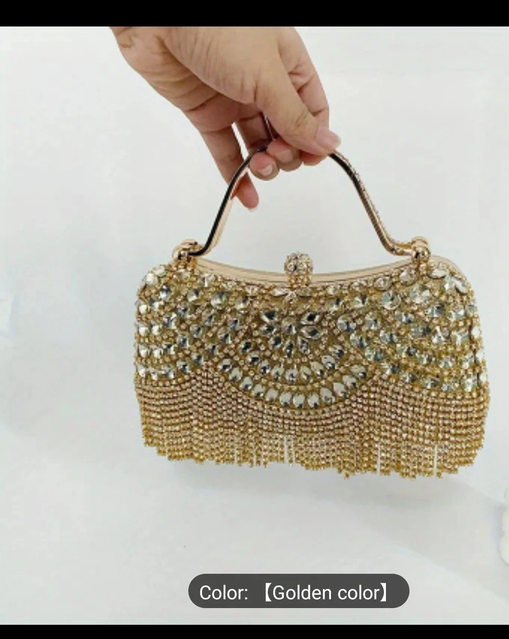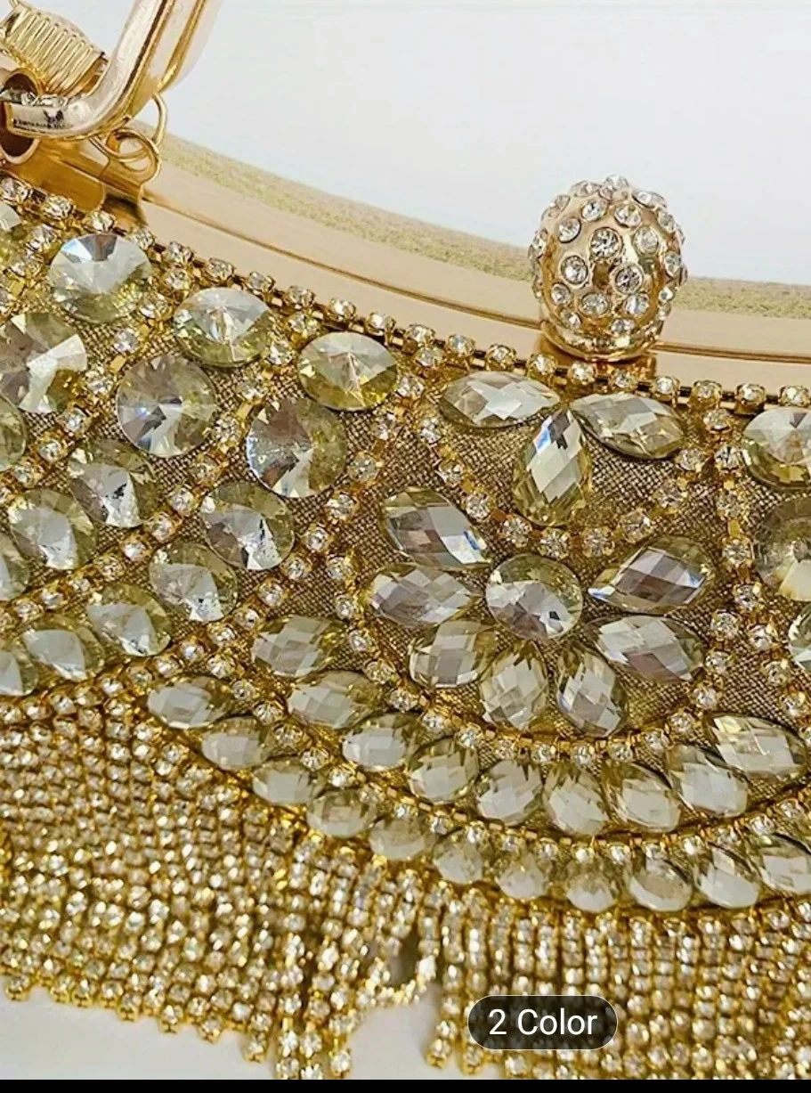 This clutch handbag is adorned with sparkling rhinestones and delicate fringe detailing. Dimensions: 20.5cm x 6cm x 19cm. It's a stunning accessory for evening events or special occasions! It is truly gorgeous in person. Elegant and Glamorous