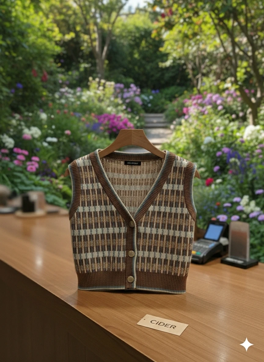 This CIDER knit vest features a classic plaid pattern. It's a sleeveless design with a button-front closure. Great for layering over shirts or blouses!