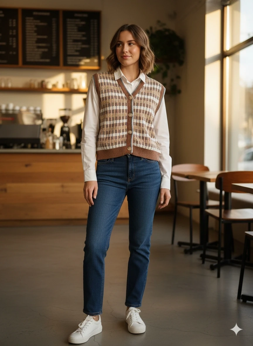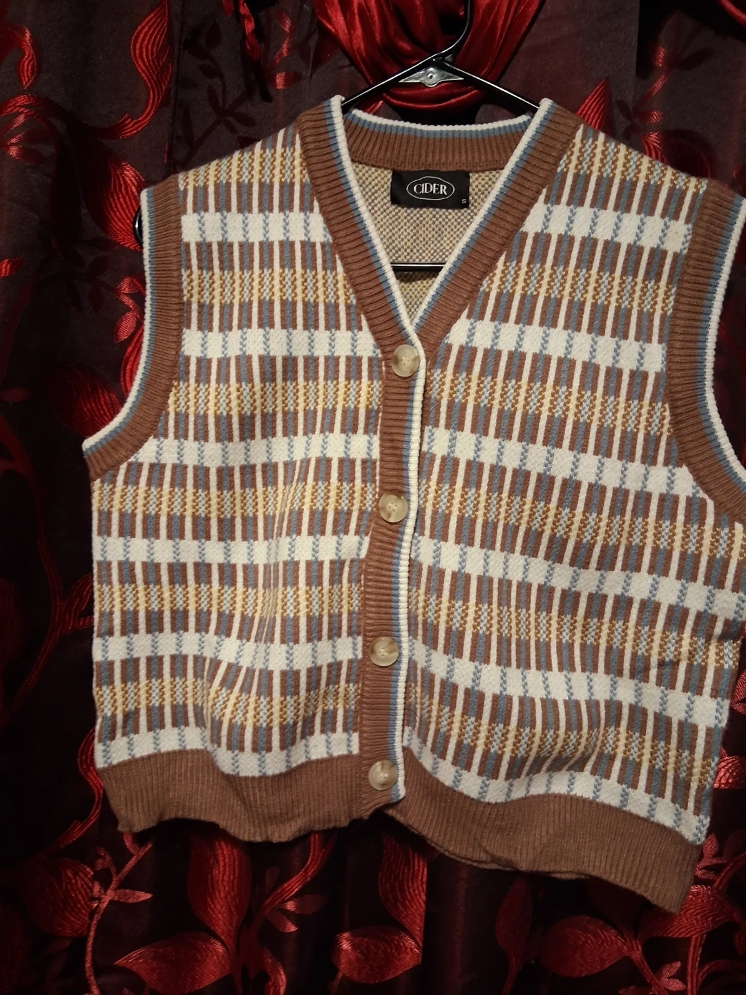 This CIDER knit vest features a classic plaid pattern. It's a sleeveless design with a button-front closure. Great for layering over shirts or blouses!
