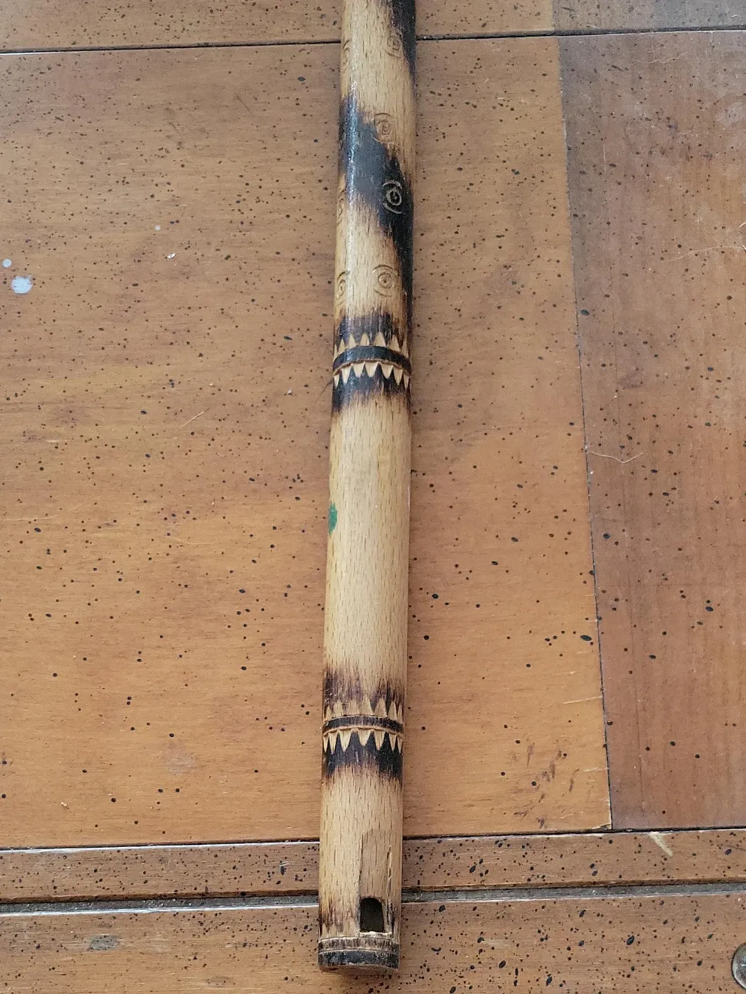 This is a unique, hand-carved wooden flute. It's made of natural wood with intricate patterns etched into the surface. The flute features a small hole at the bottom for airflow.