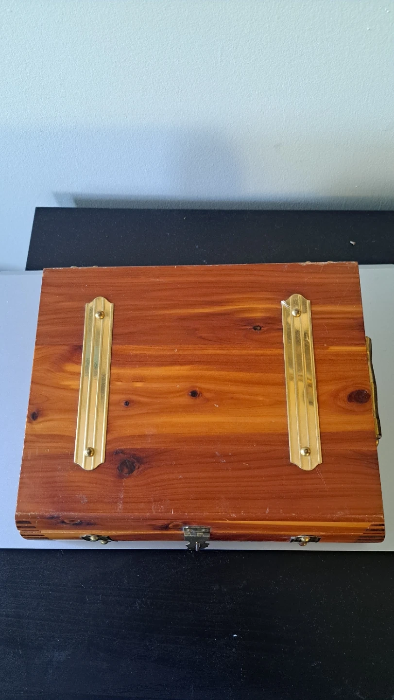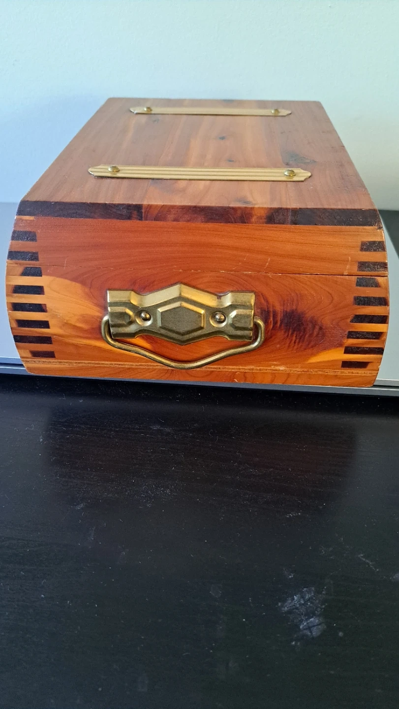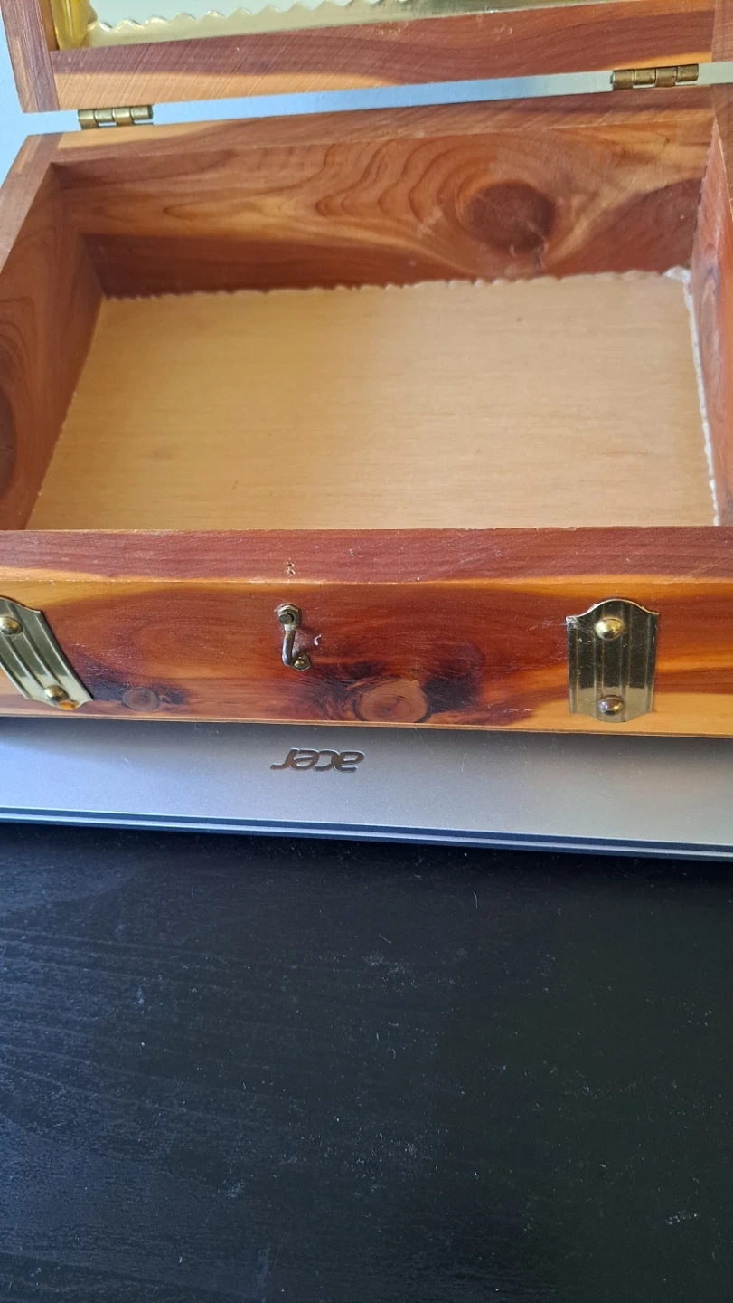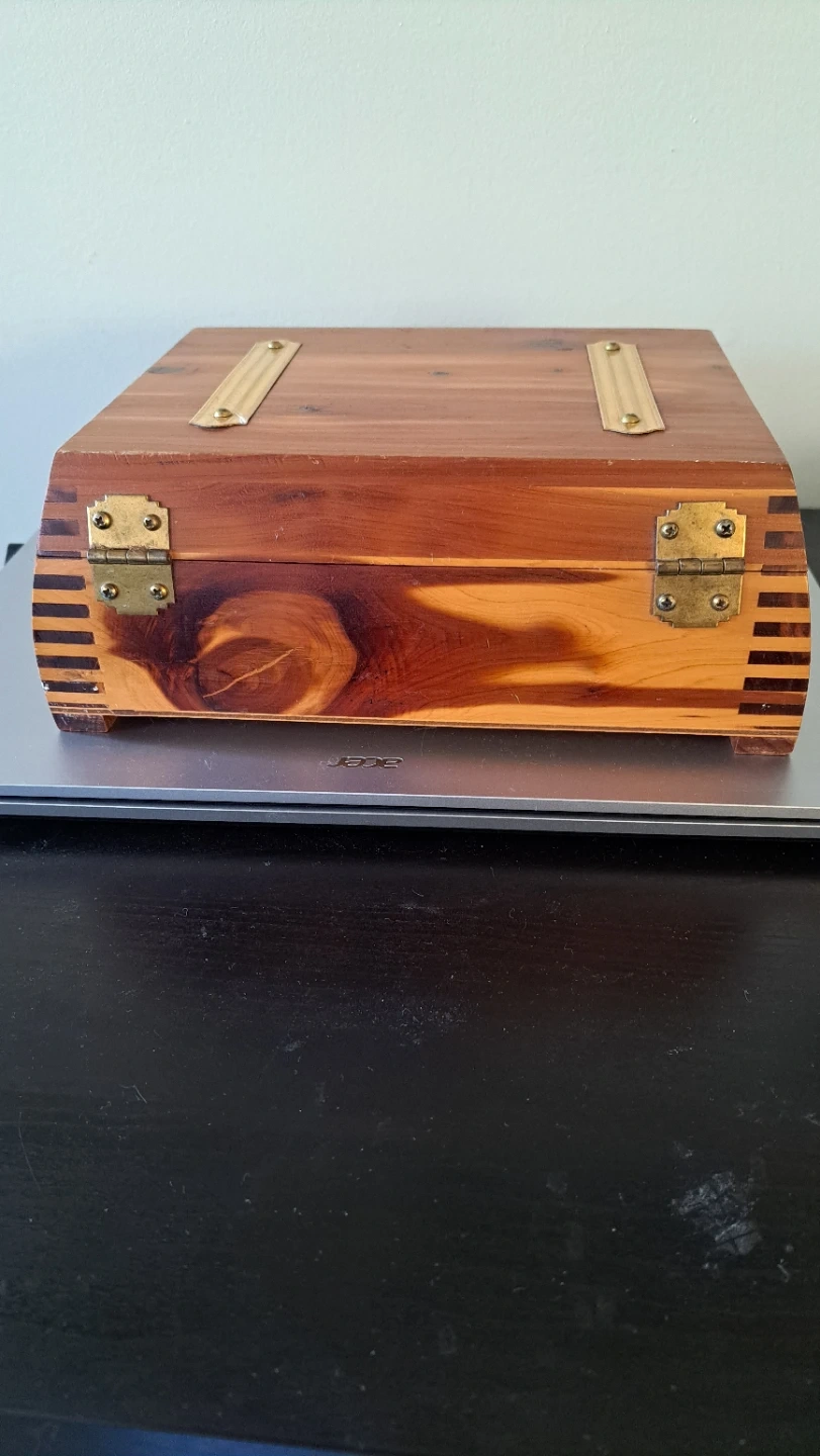 This cedar trinket box features a mirrored lid and brass hardware. It has a decorative striped inlay on the front and sides. It's perfect for storing small keepsakes or jewelry!