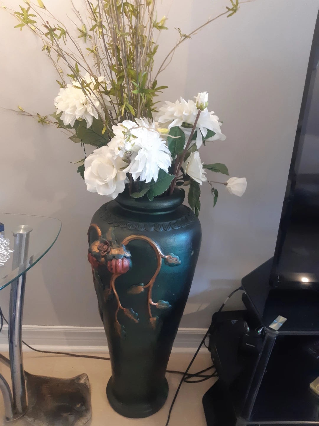 Tall dark green vase. Features gold detailing and floral accents. Holds artificial flower arrangement. Perfect for home decor.