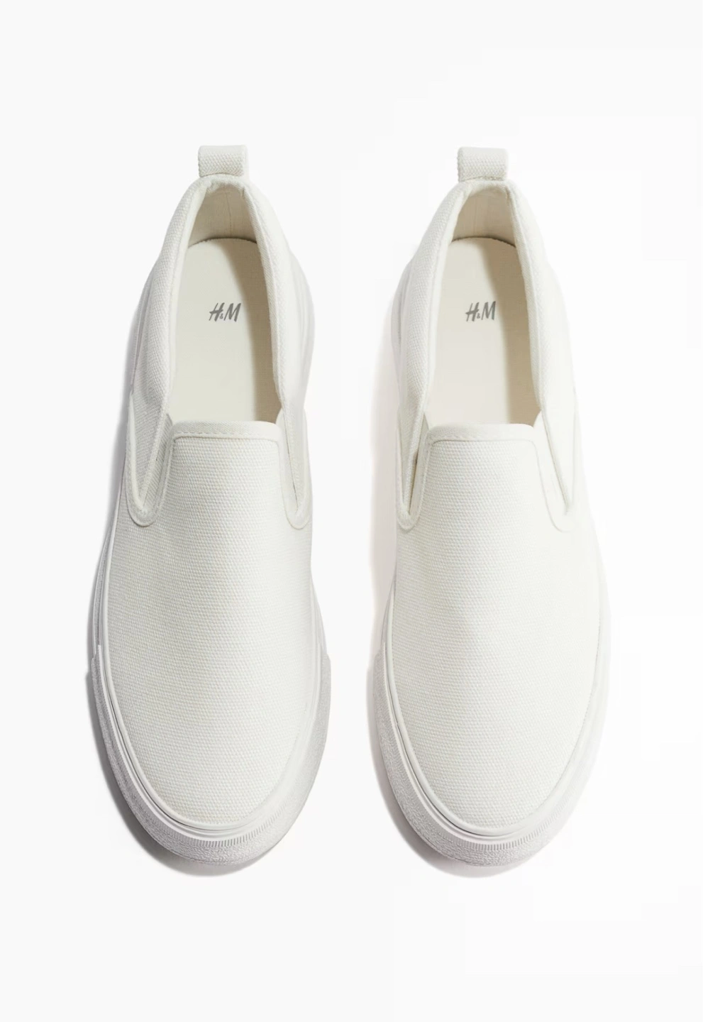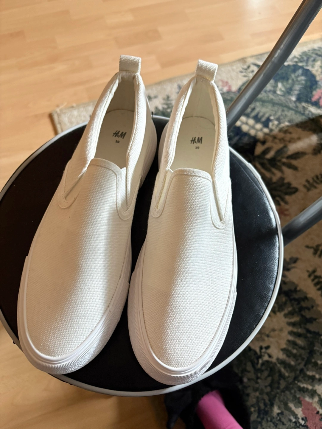 Women's white canvas slip-on sneakers. Size 39. Features padded edges and elastic side panels. Cotton canvas lining and insoles. Used only once